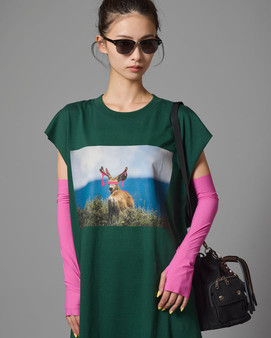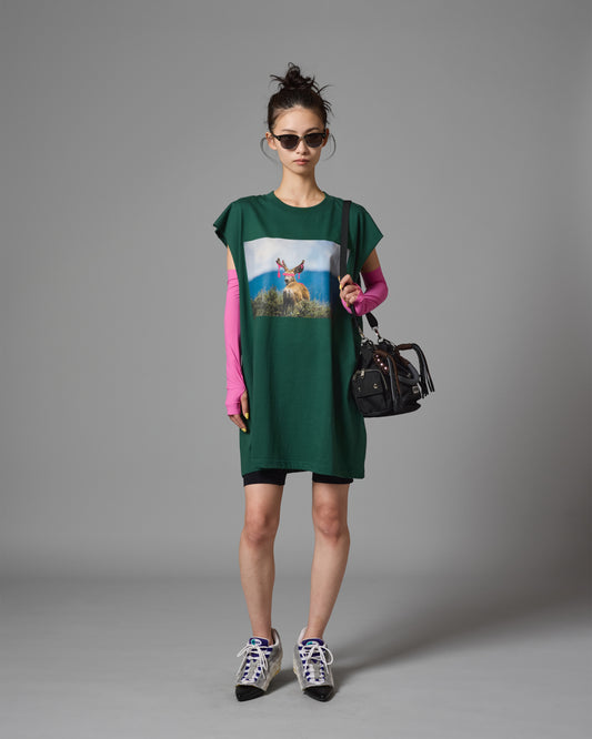 DEER PRINT NO-SLEEVE T-SHIRT (GREEN)