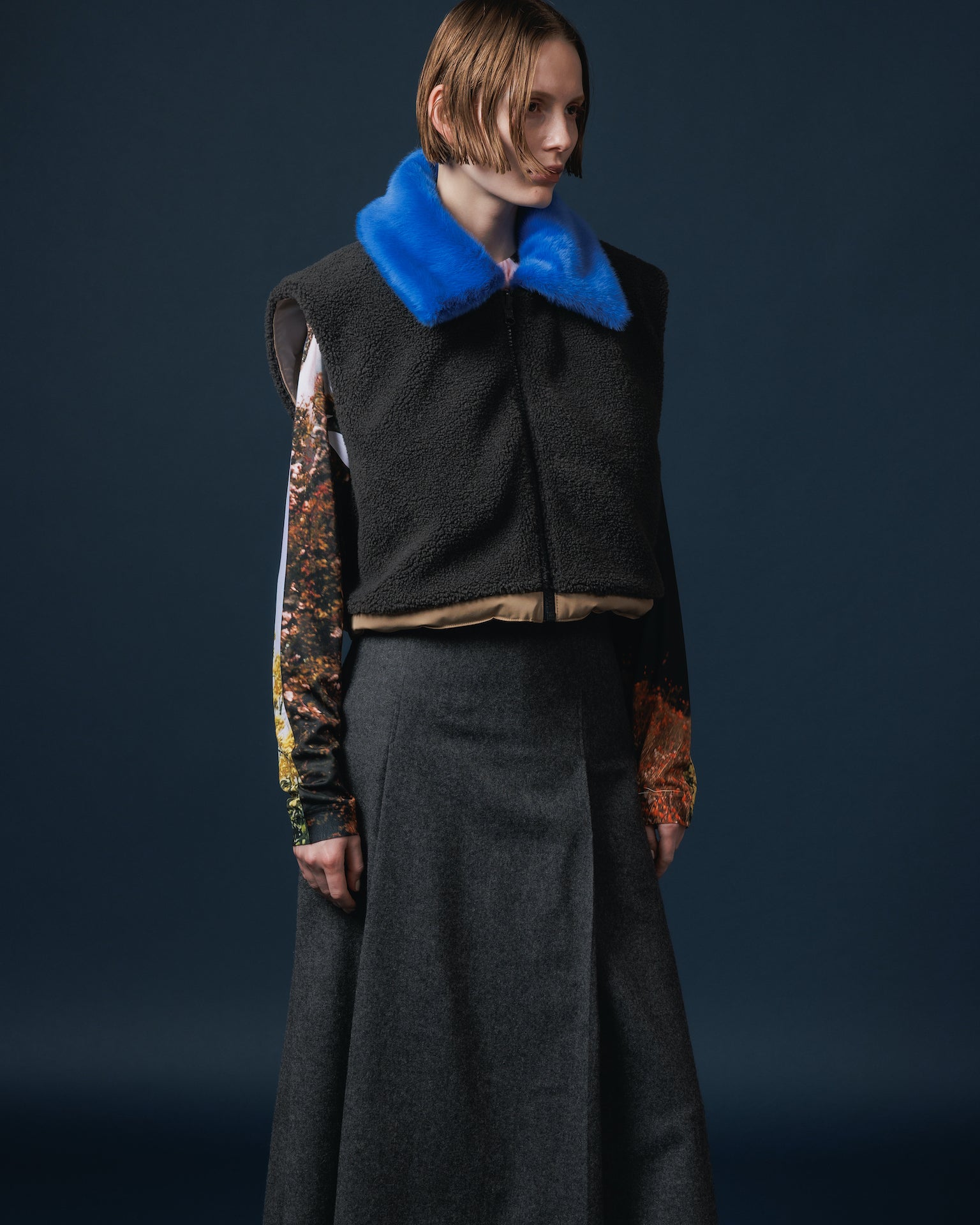 ドンキージャケットをショート丈にした様なデザインと、カラーファーの襟と身頃の配色が特徴です。