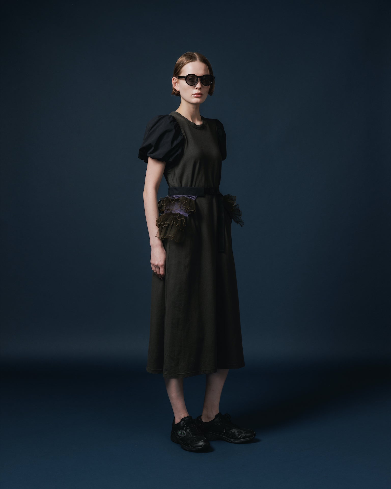 バルーンシルエットの袖が付いたTシャツワンピース。