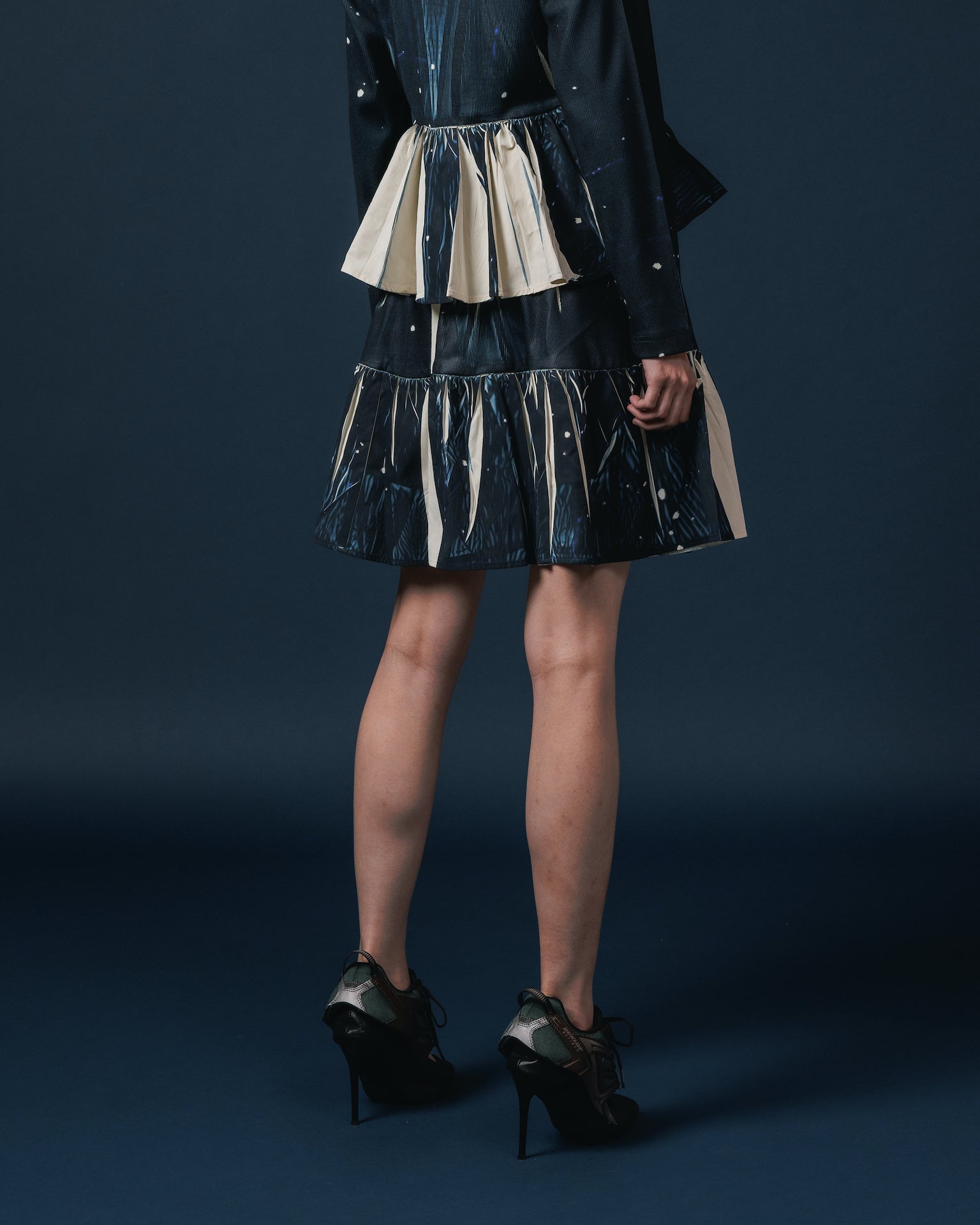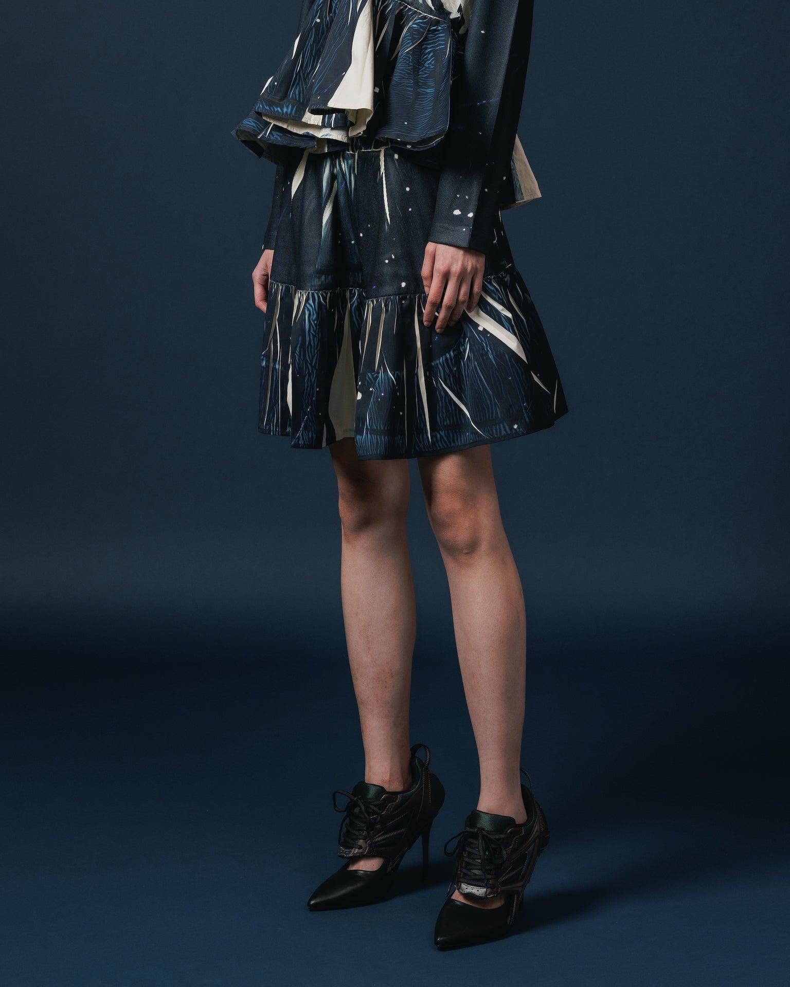 転写フォトプリントが施されたギャザーミニスカート。