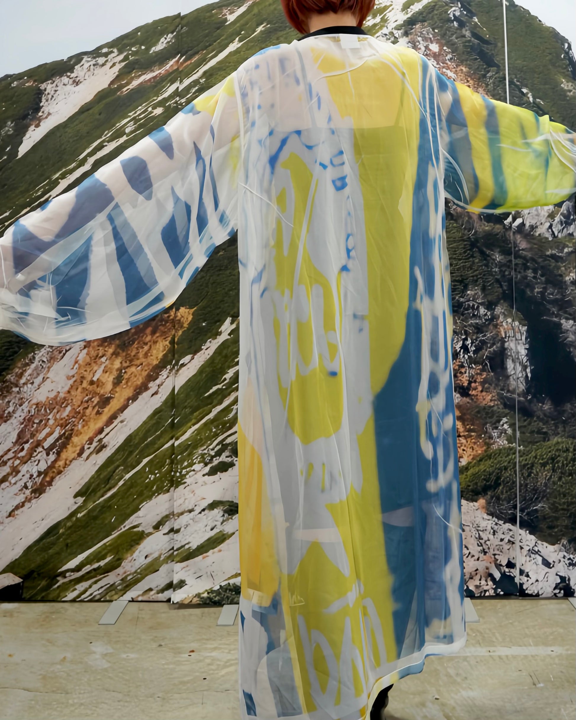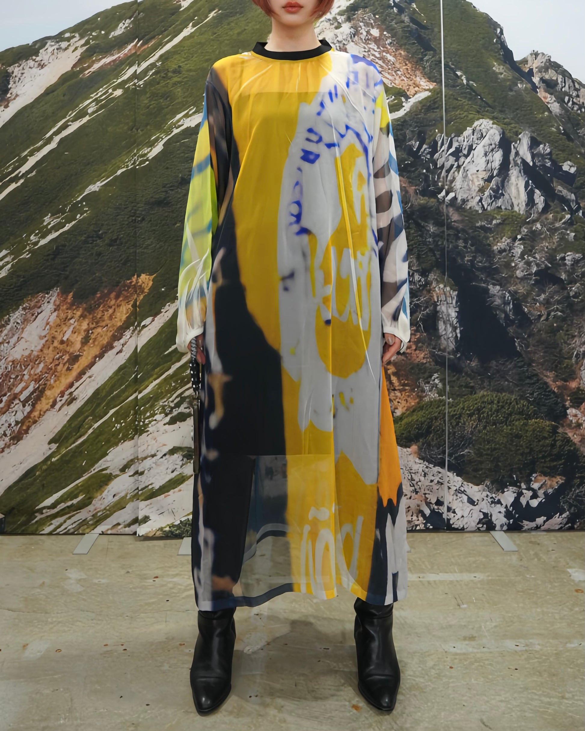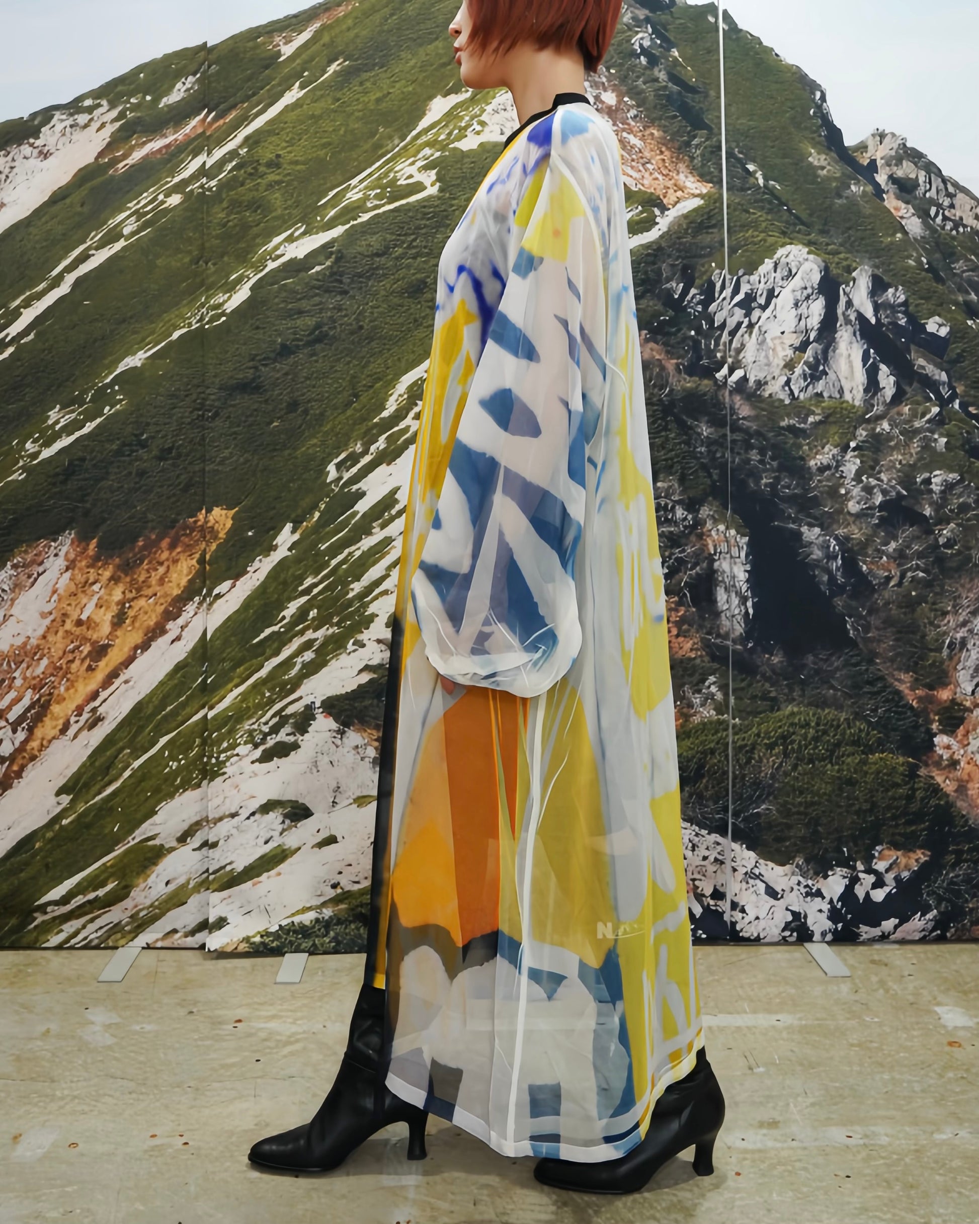 落ち感と透明感のある極薄地のシフォンにダイレクトにプリントを施している為、1点1点シワやアタリなどが異なります。