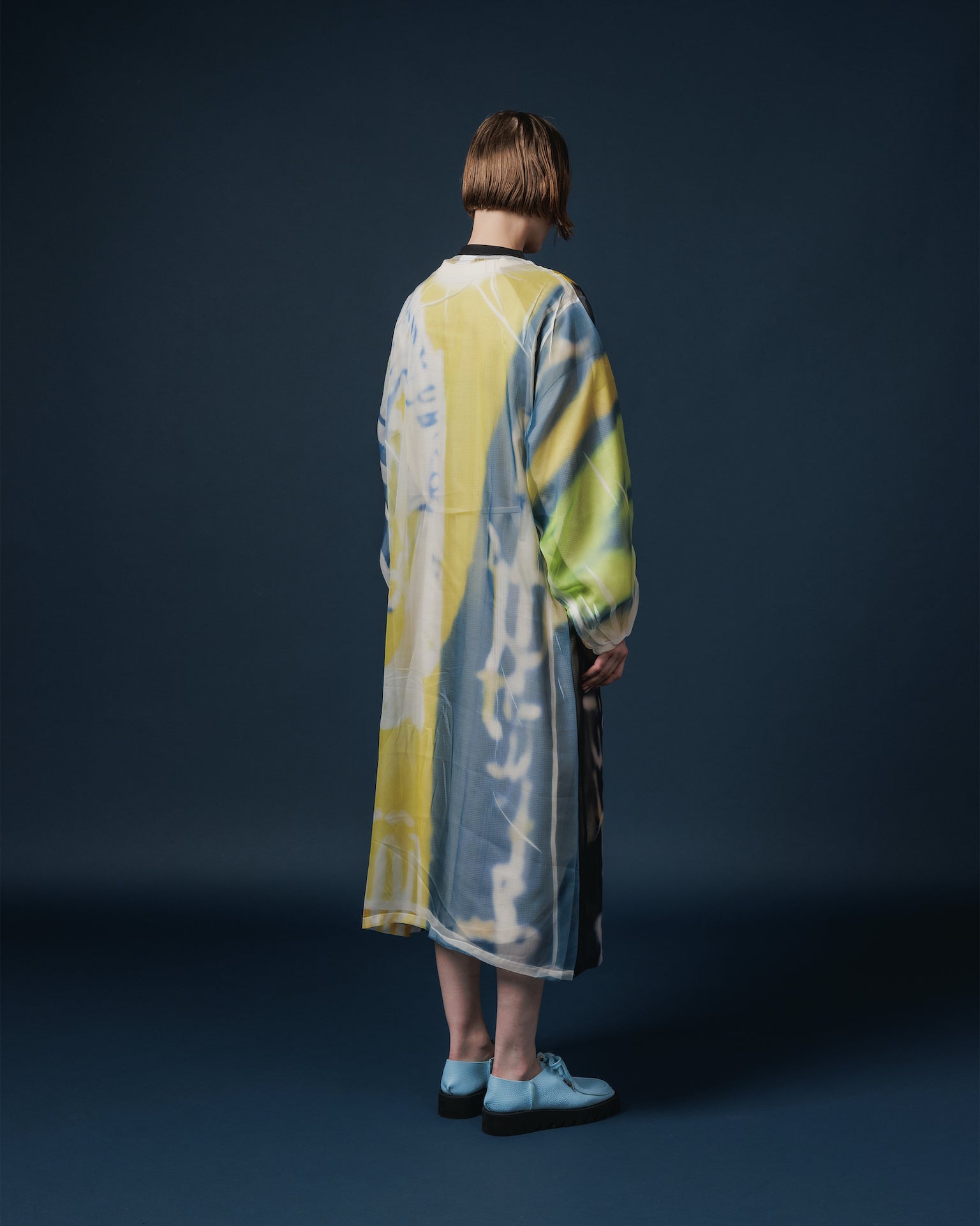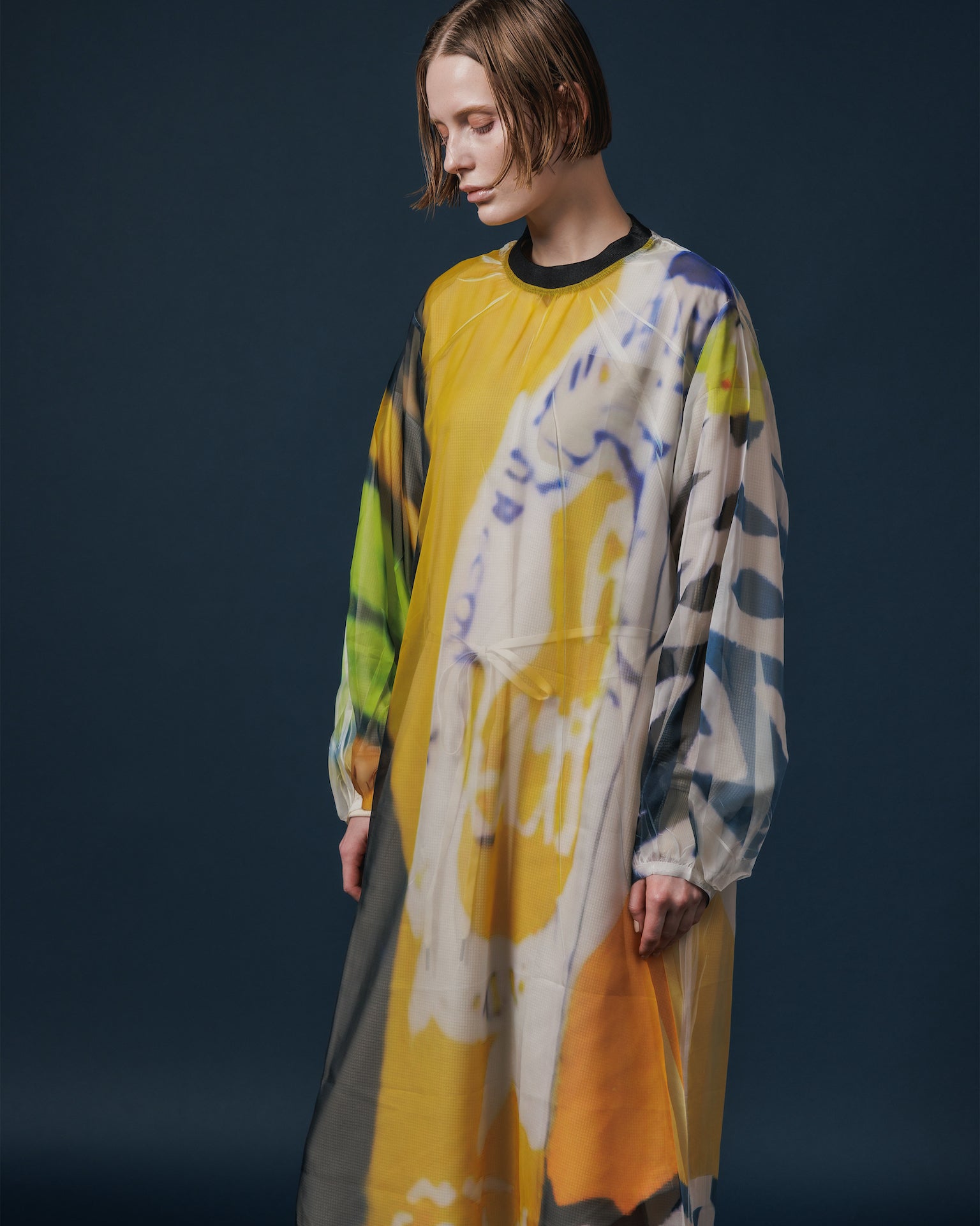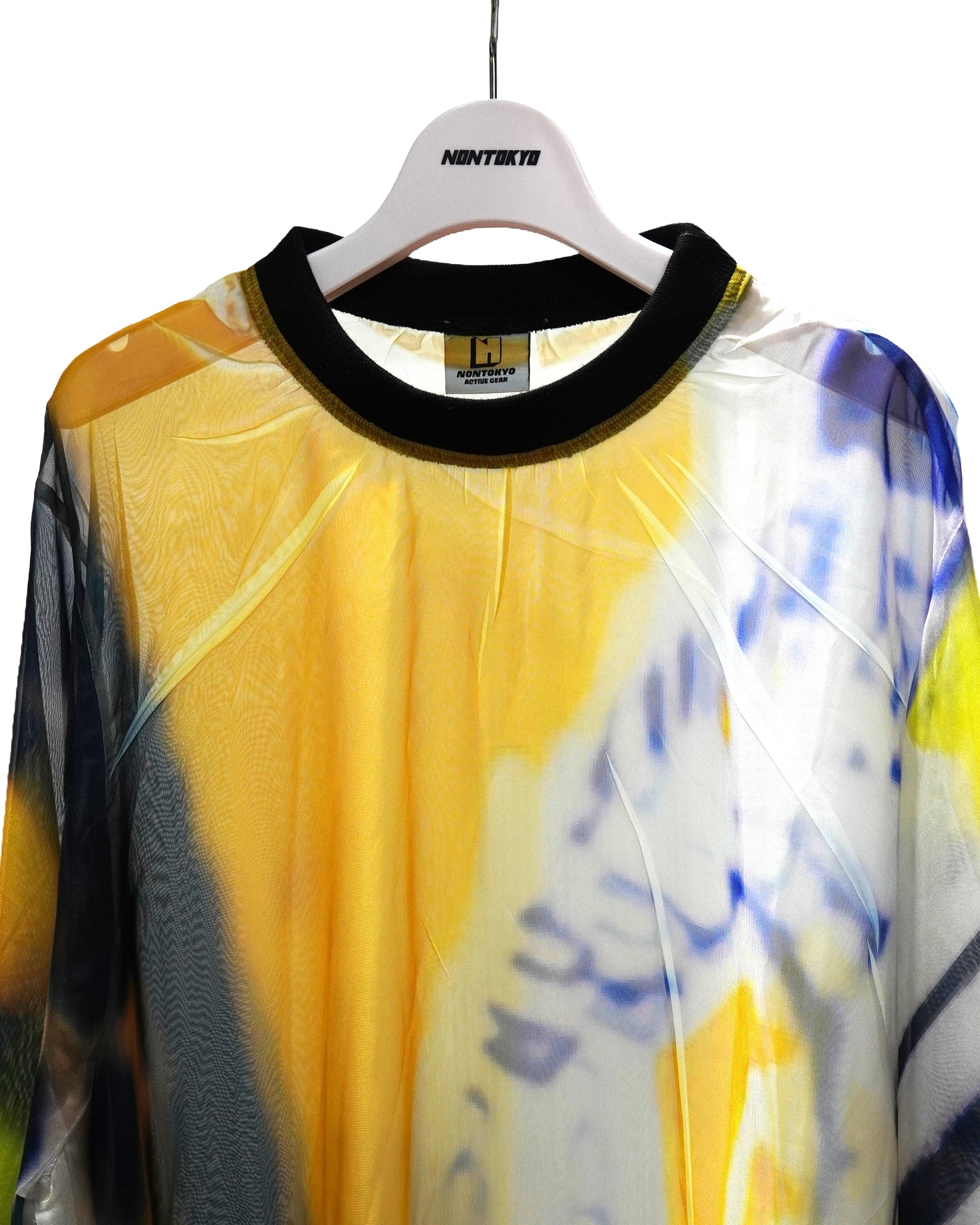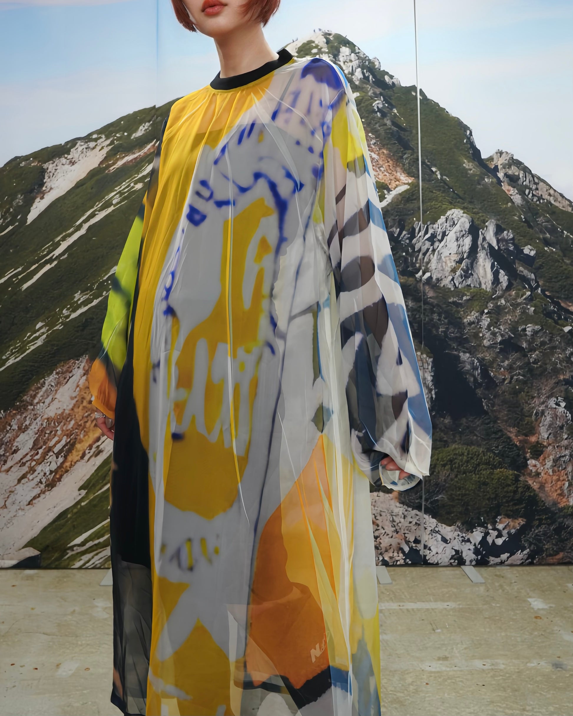 落ち感と透明感のある極薄地のシフォンにダイレクトにプリントを施している為、1点1点シワやアタリなどが異なります。