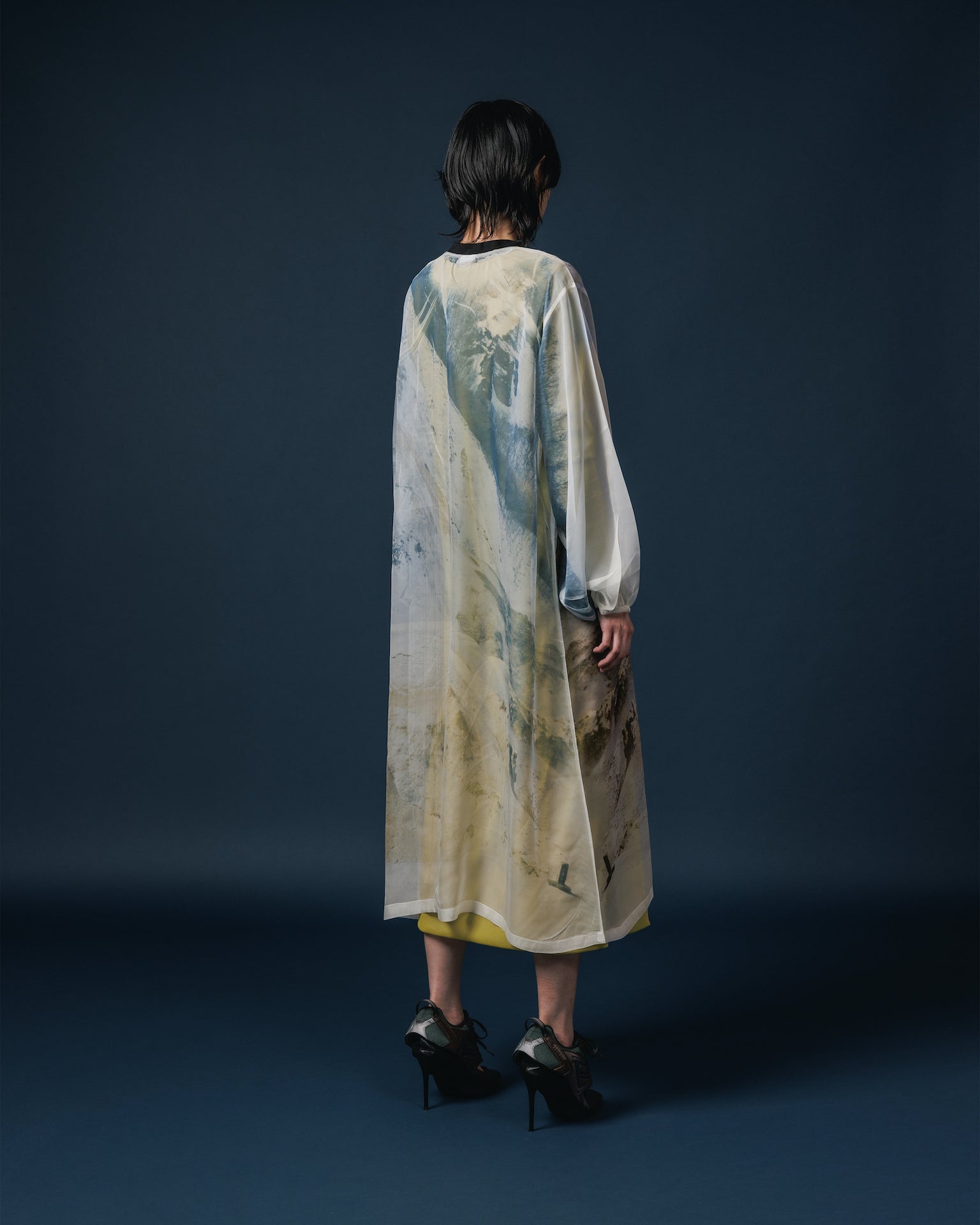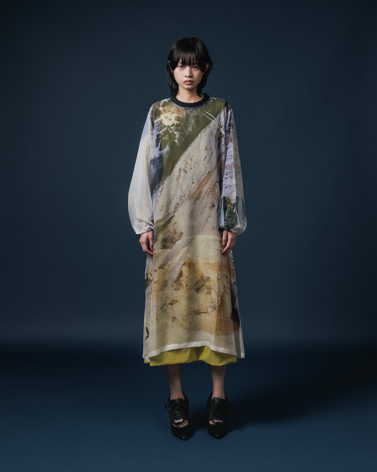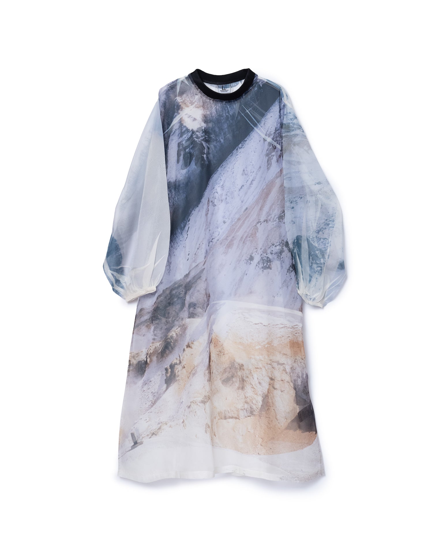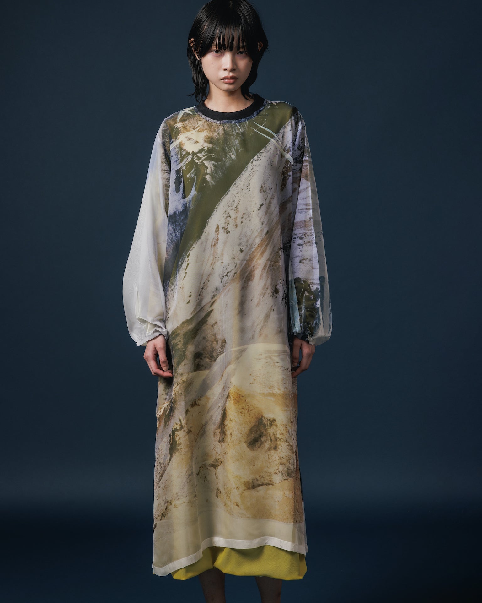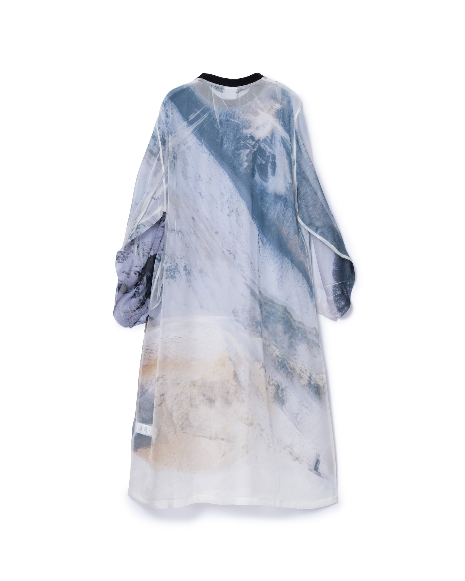 落ち感と透明感のある極薄地のシフォンにダイレクトにプリントを施している為、1点1点シワやアタリなどが異なります。