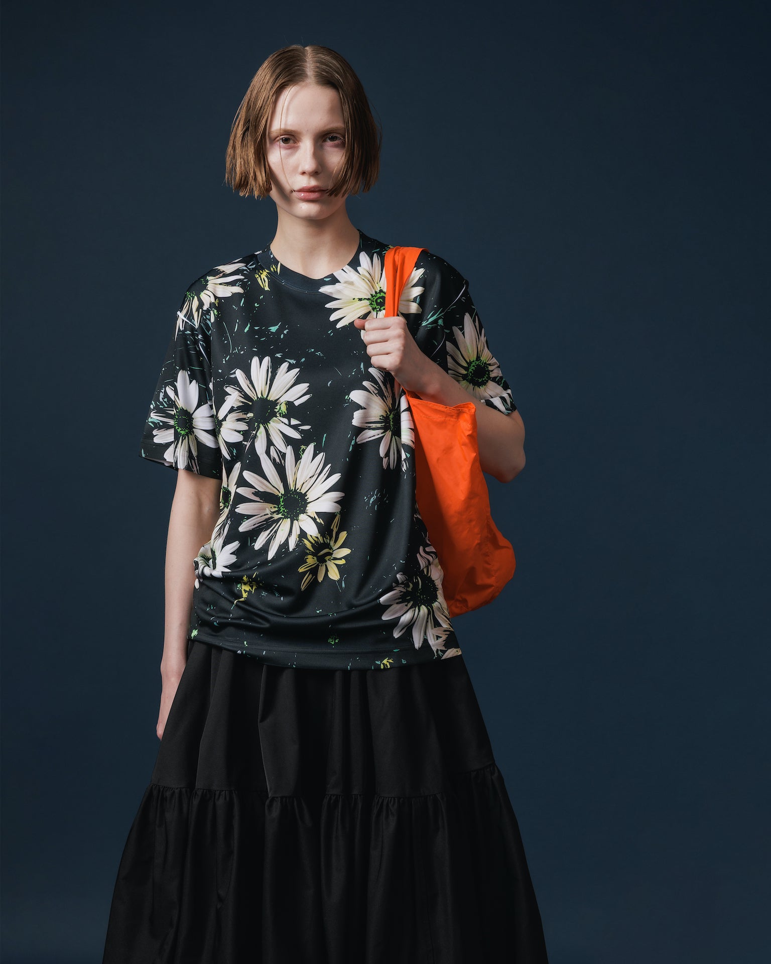 ダイレクトに転写プリントが施された半袖Tシャツ。