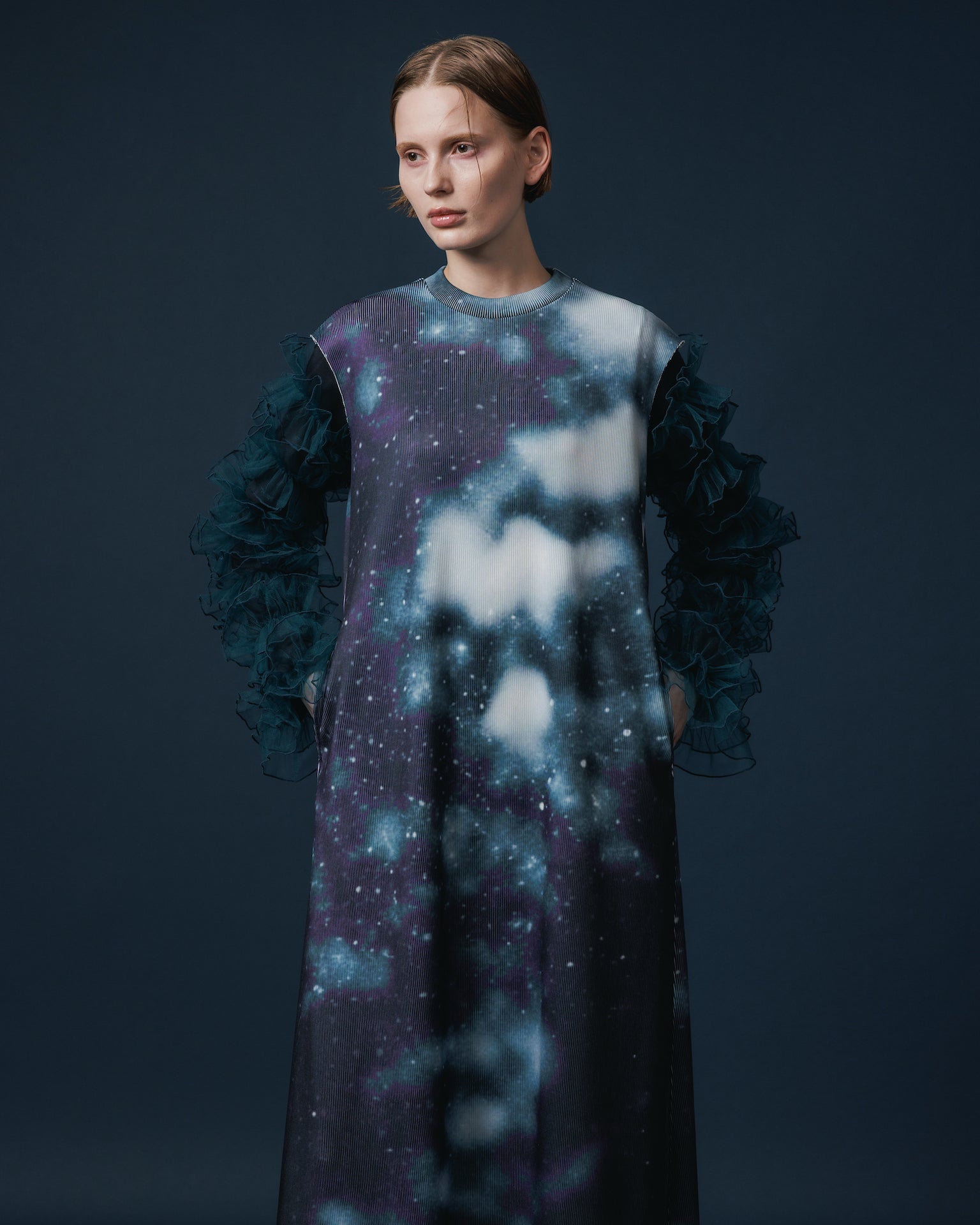 袖にふんだんに入れられたチュールフリルが特徴のカットソー。