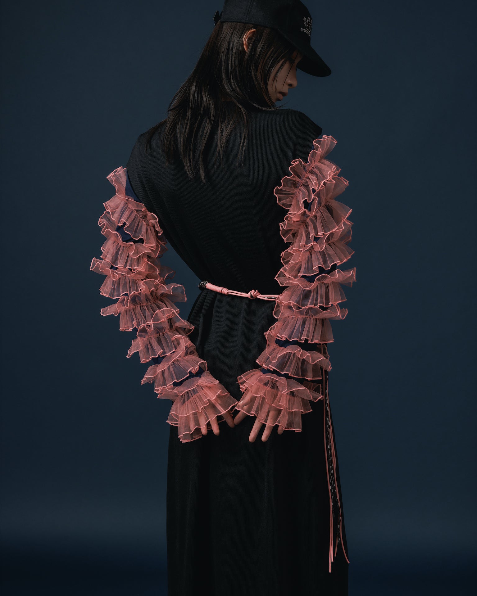袖にふんだんに入れられたチュールフリルが特徴のカットソー。