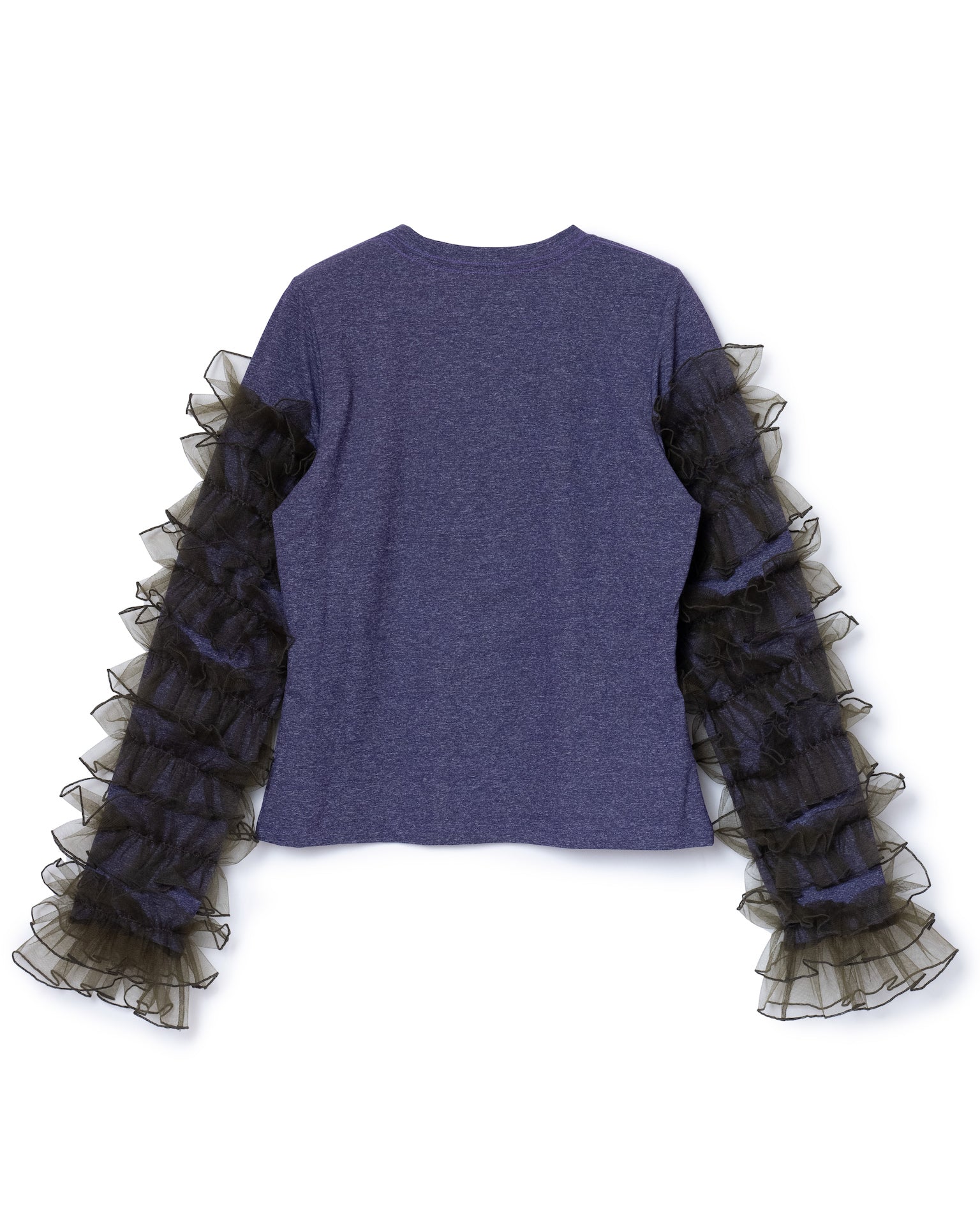 袖にふんだんに入れられたチュールフリルが特徴のカットソー。