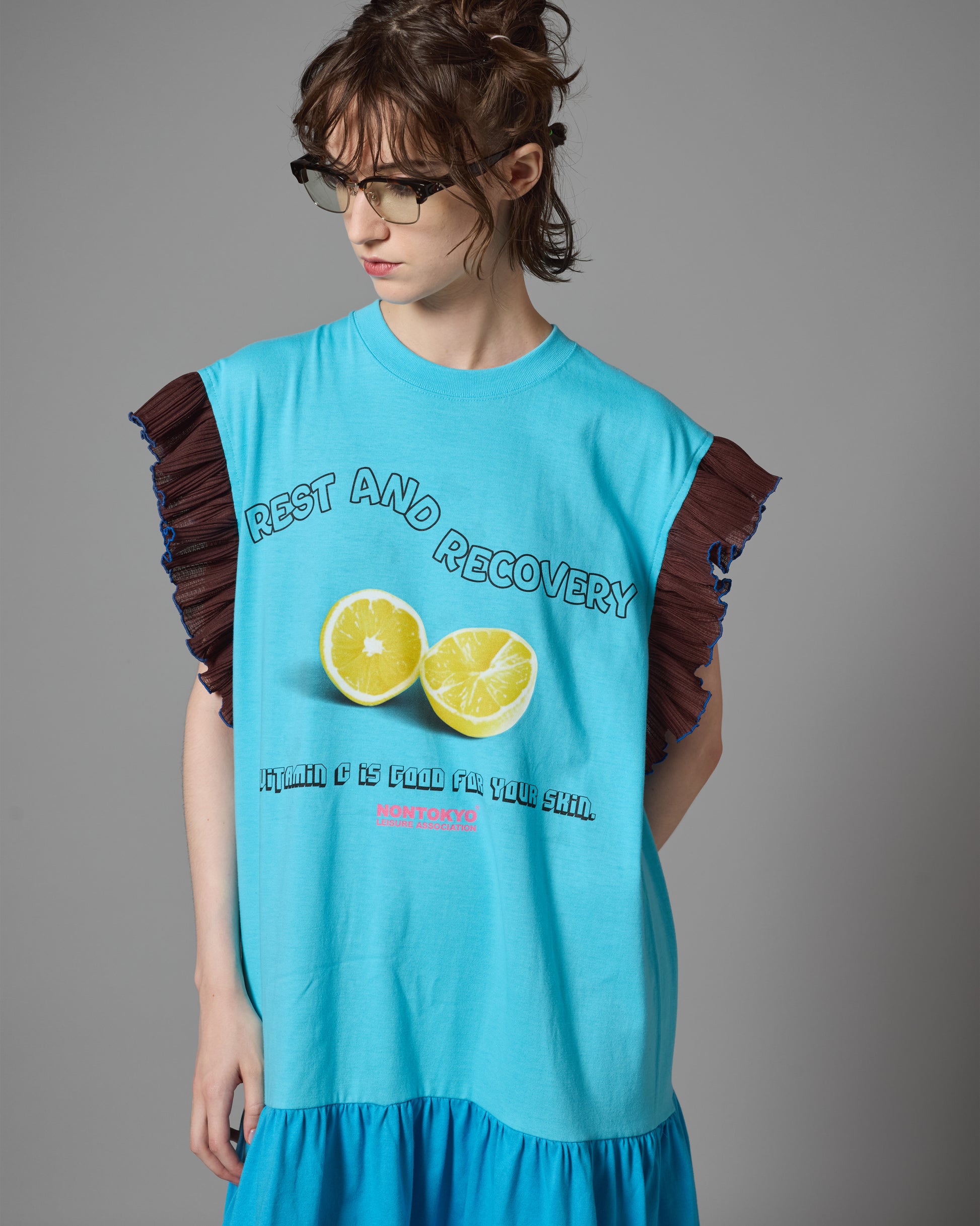 ドレッシーなフリルをデイリーユース出来るTシャツと組み合わせたウェアです。