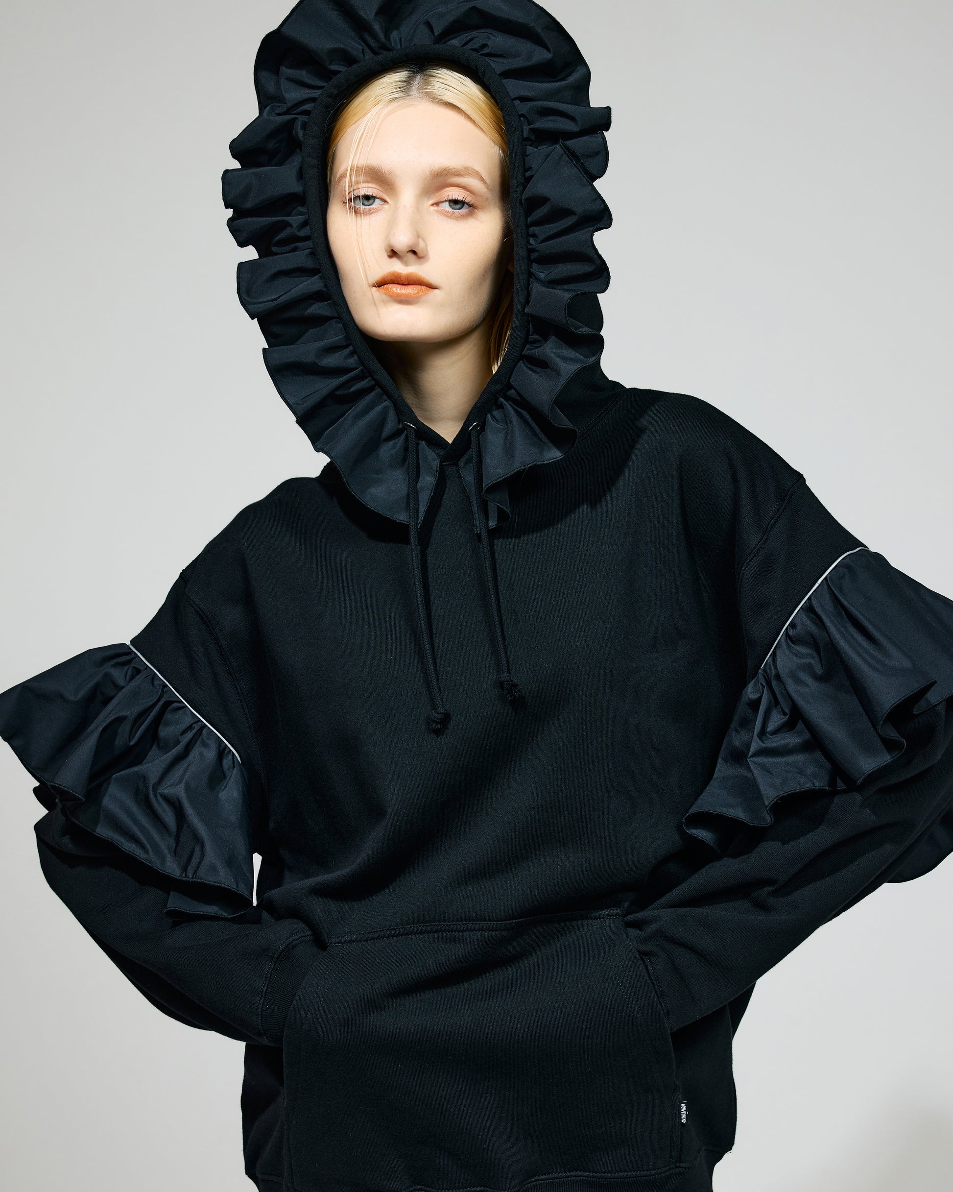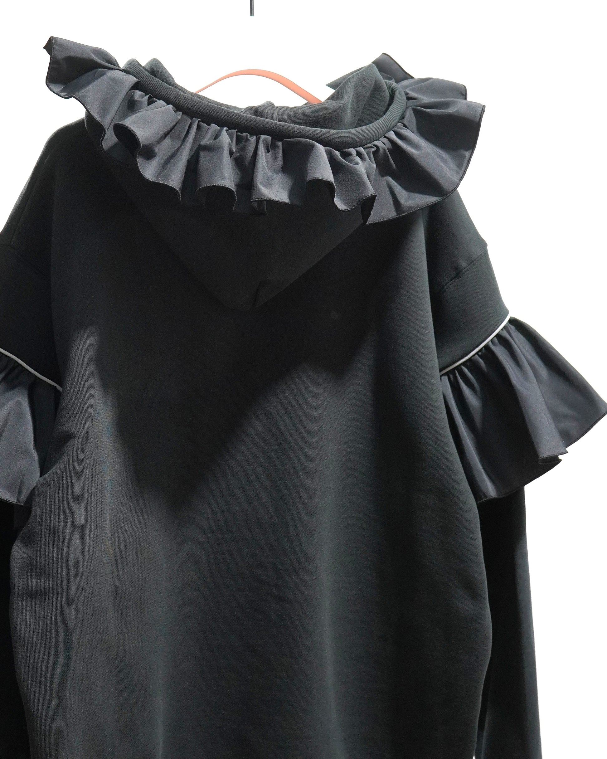 フリルが各所に散りばめられたプルオーバーフーディー。