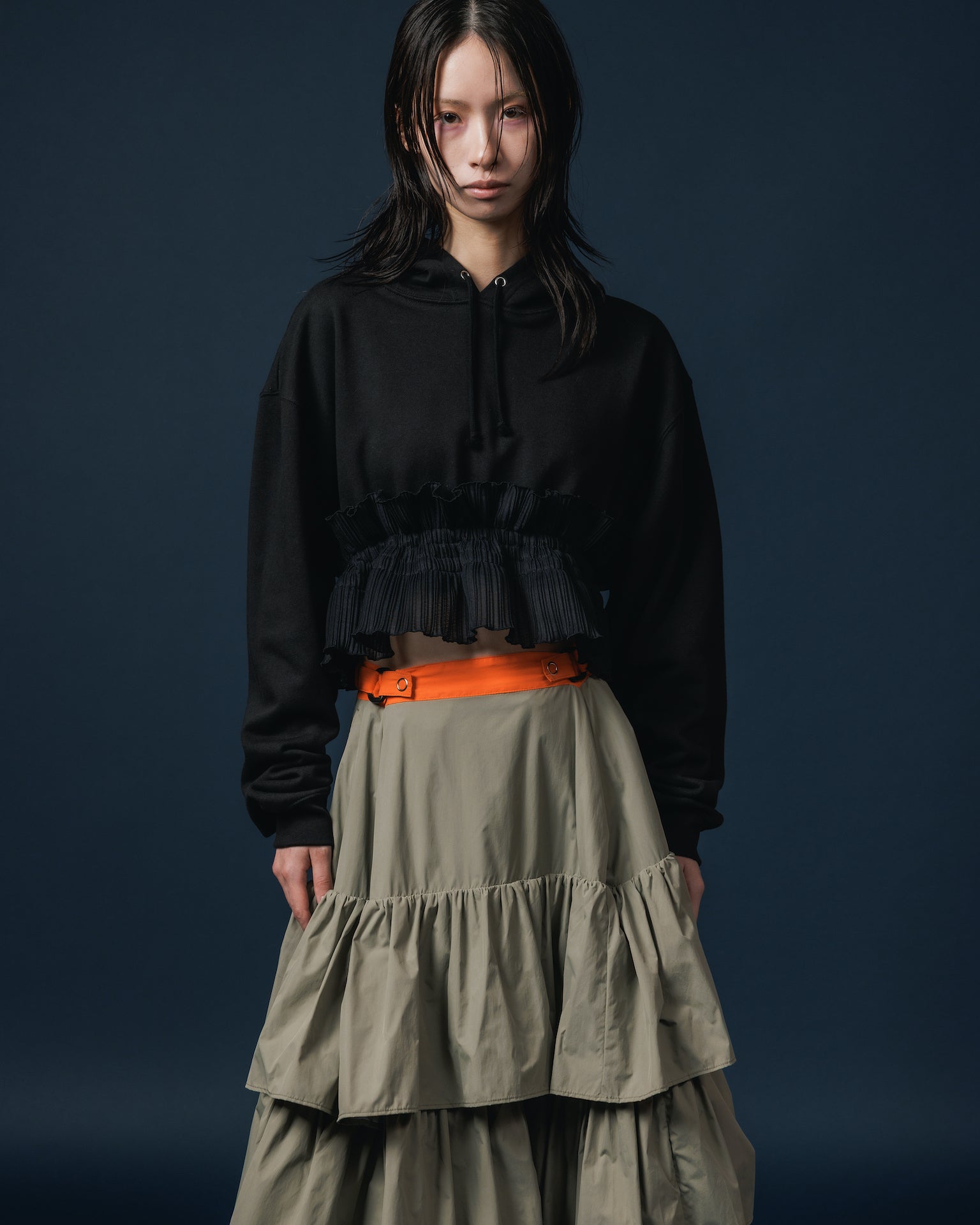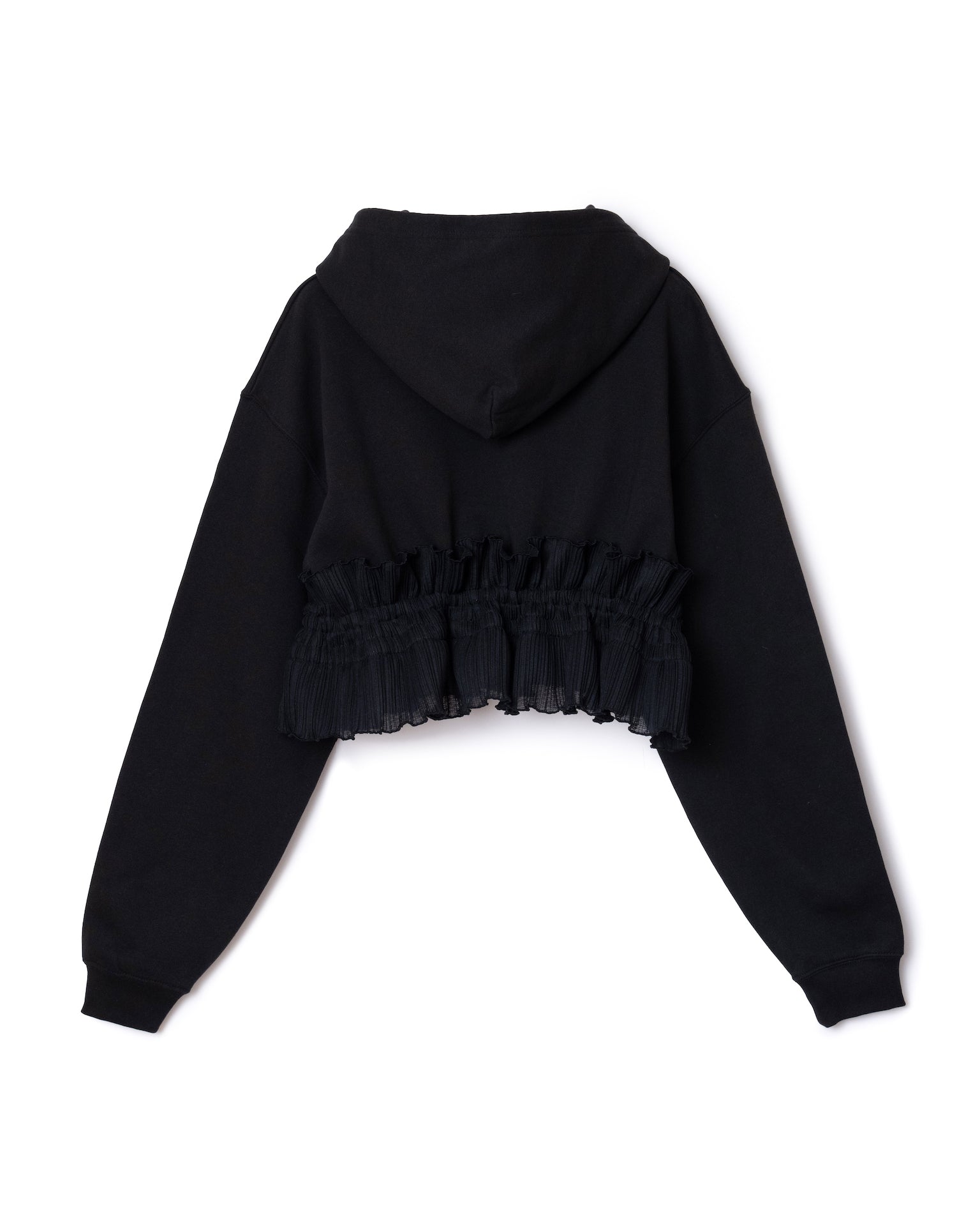 裾にフリルパーツがドッキングしたプルオーバーパーカー。