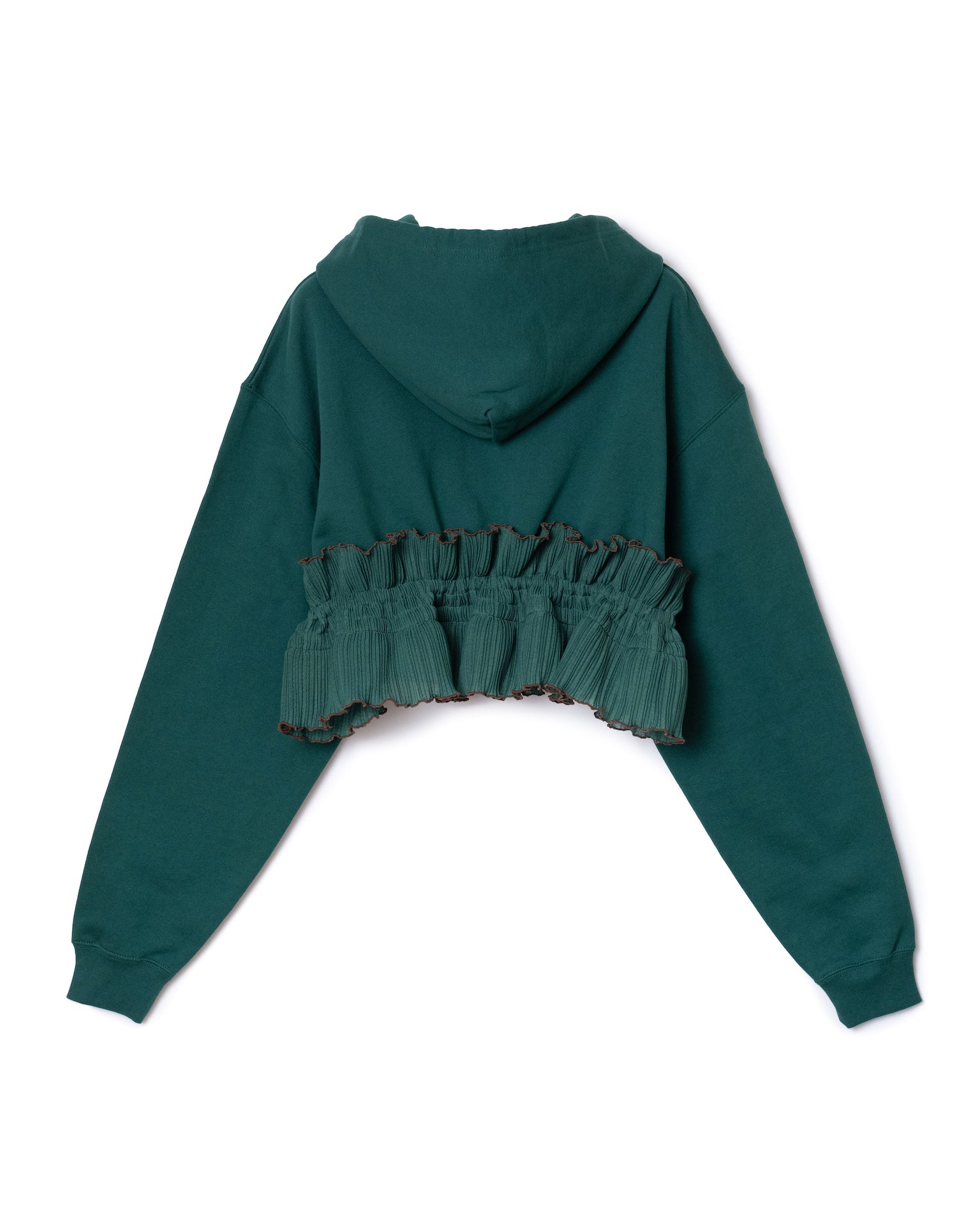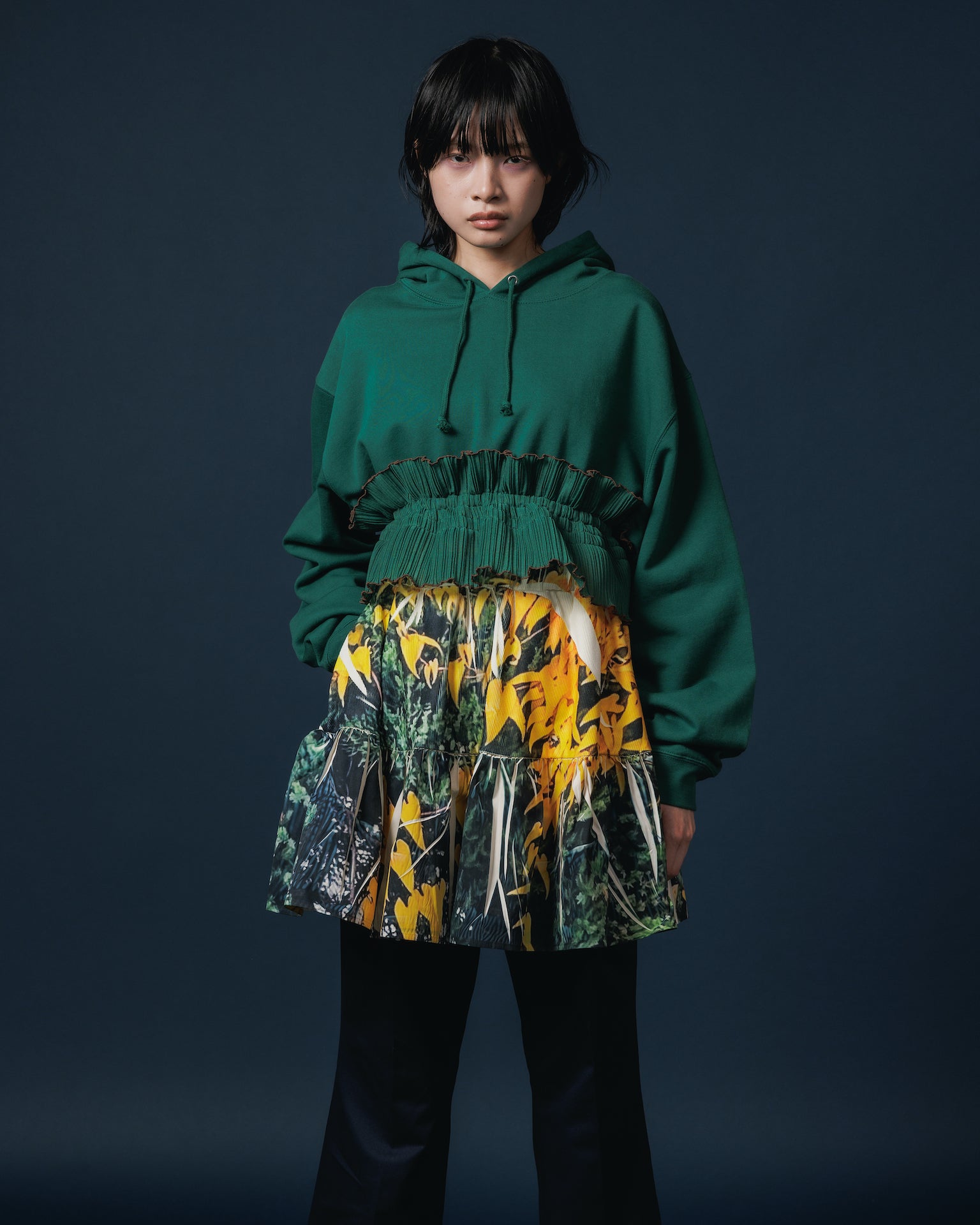 裾にフリルパーツがドッキングしたプルオーバーパーカー。