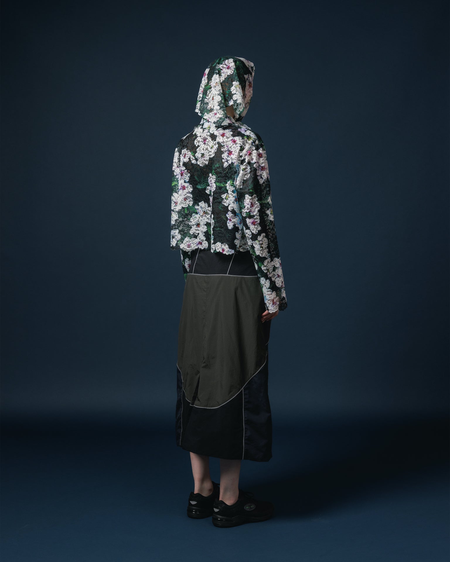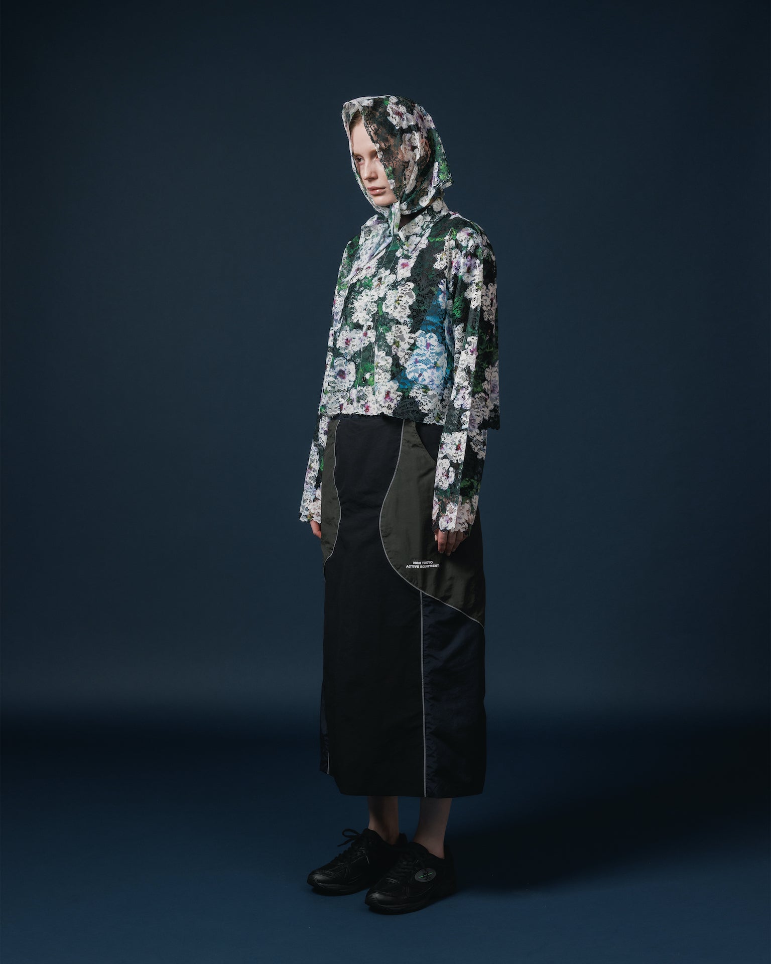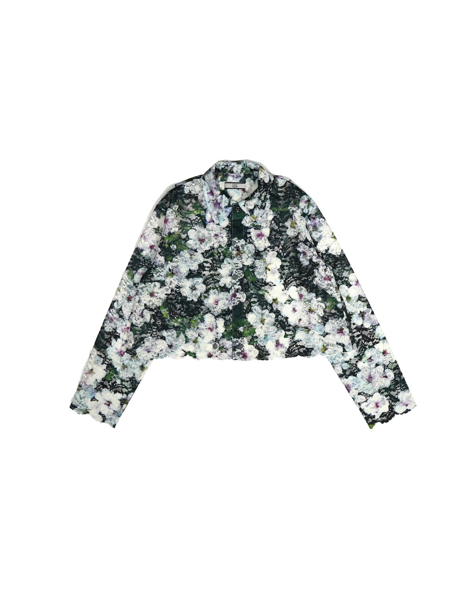 オリジナルの転写プリントが入ったレースの長袖シャツ。