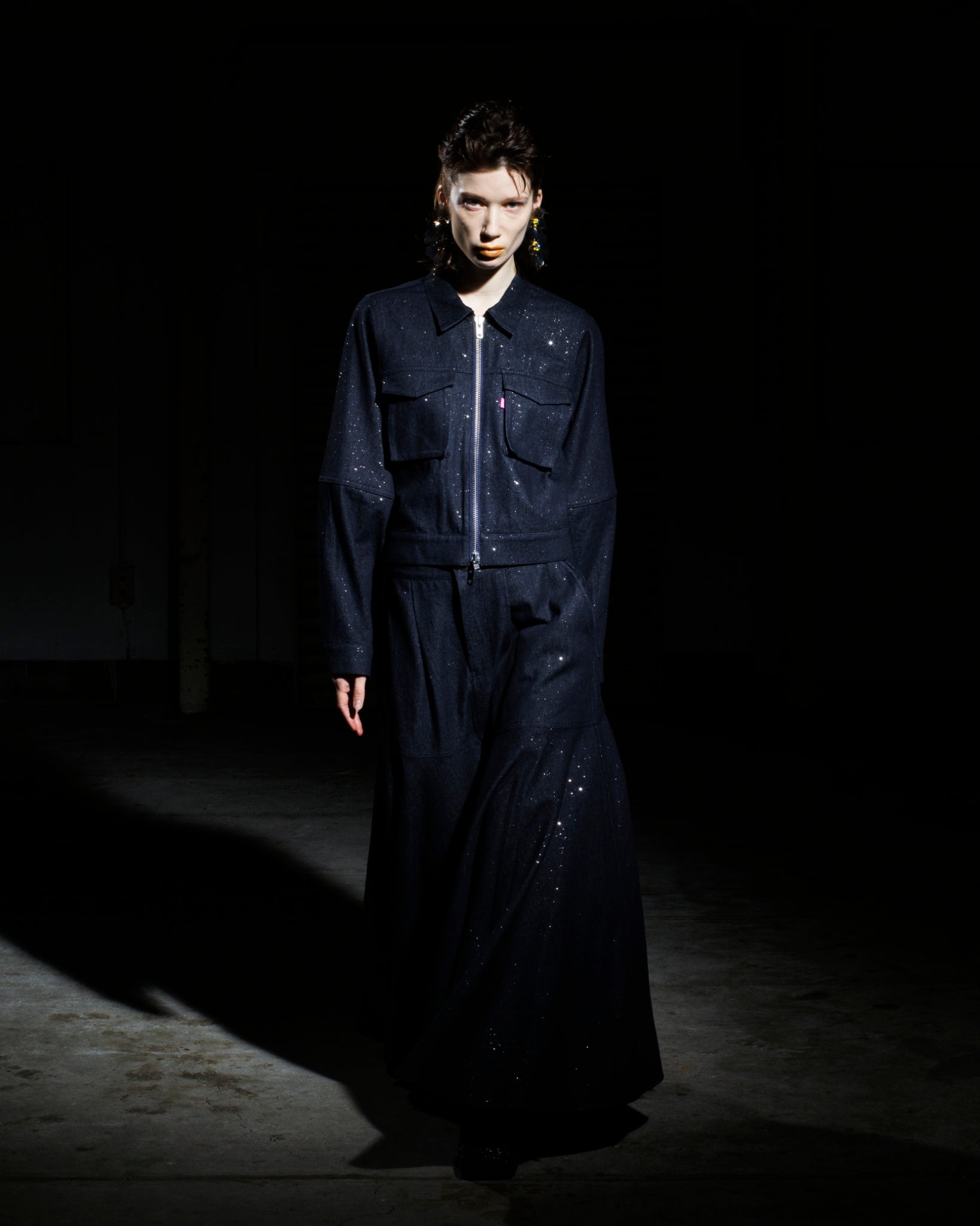 下に向かってフレア分量が多くなっているので、ボリューム感はありつつもスッキリとしたシルエットです。