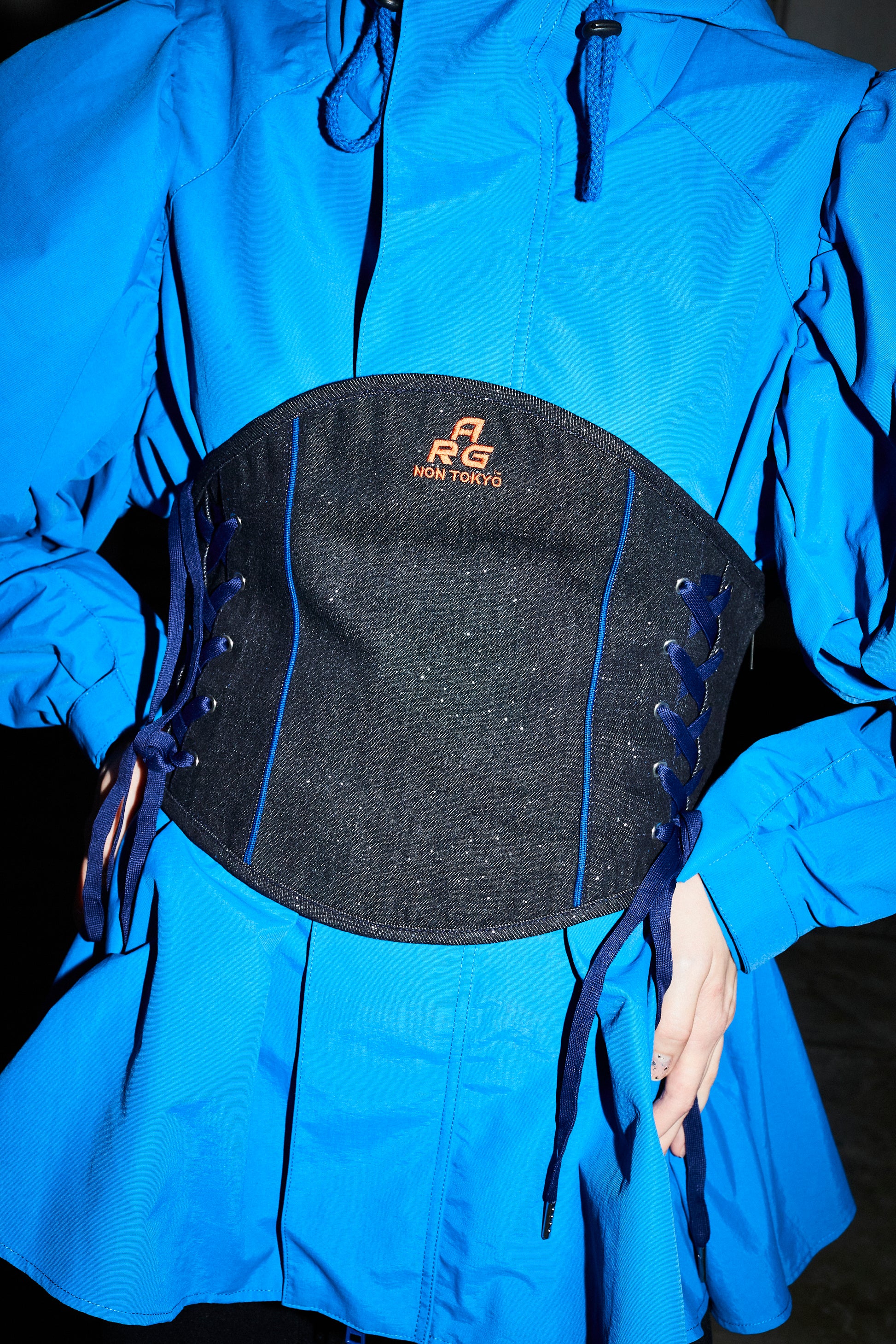 ラメ加工を施したレースアップのデニムコルセット。