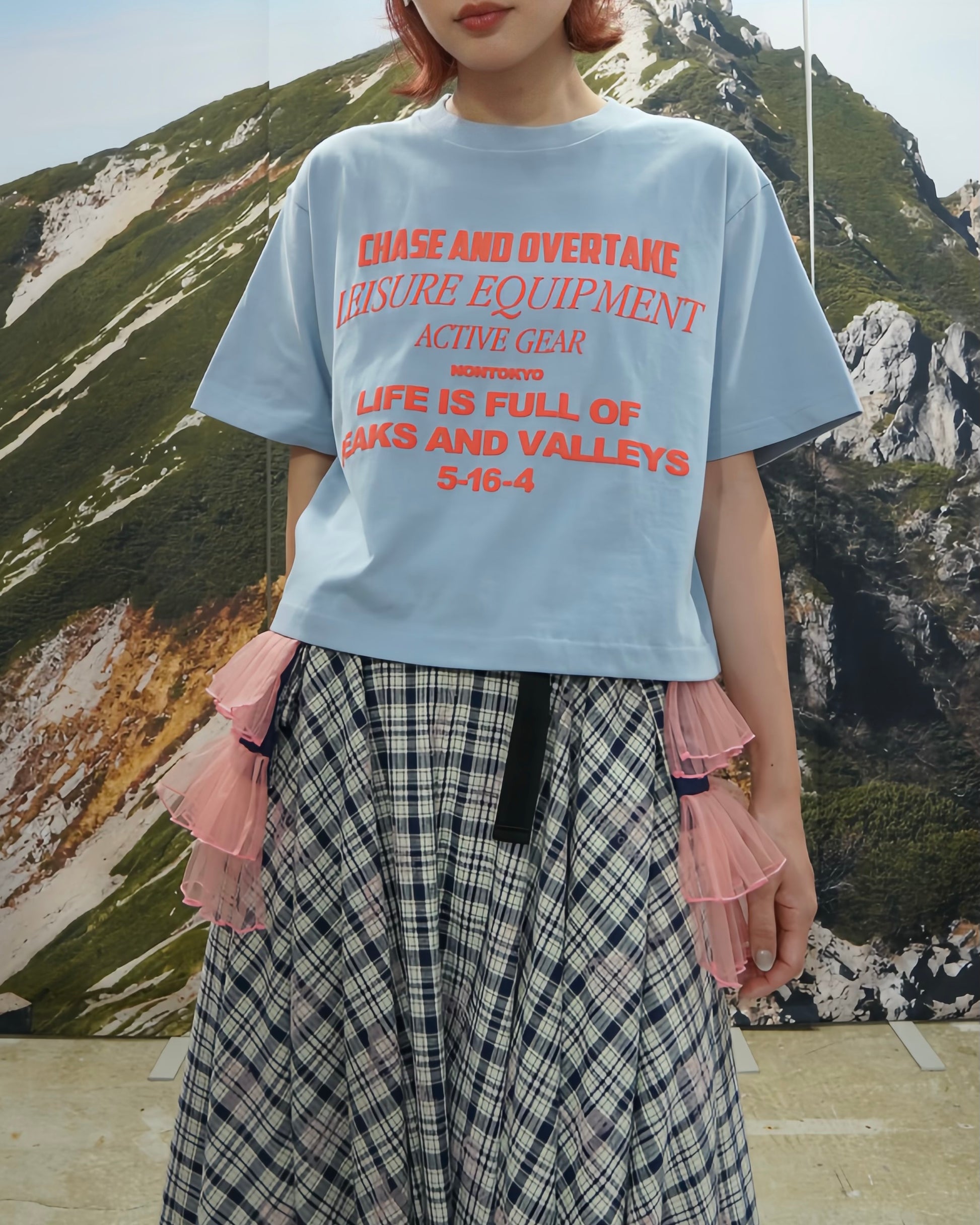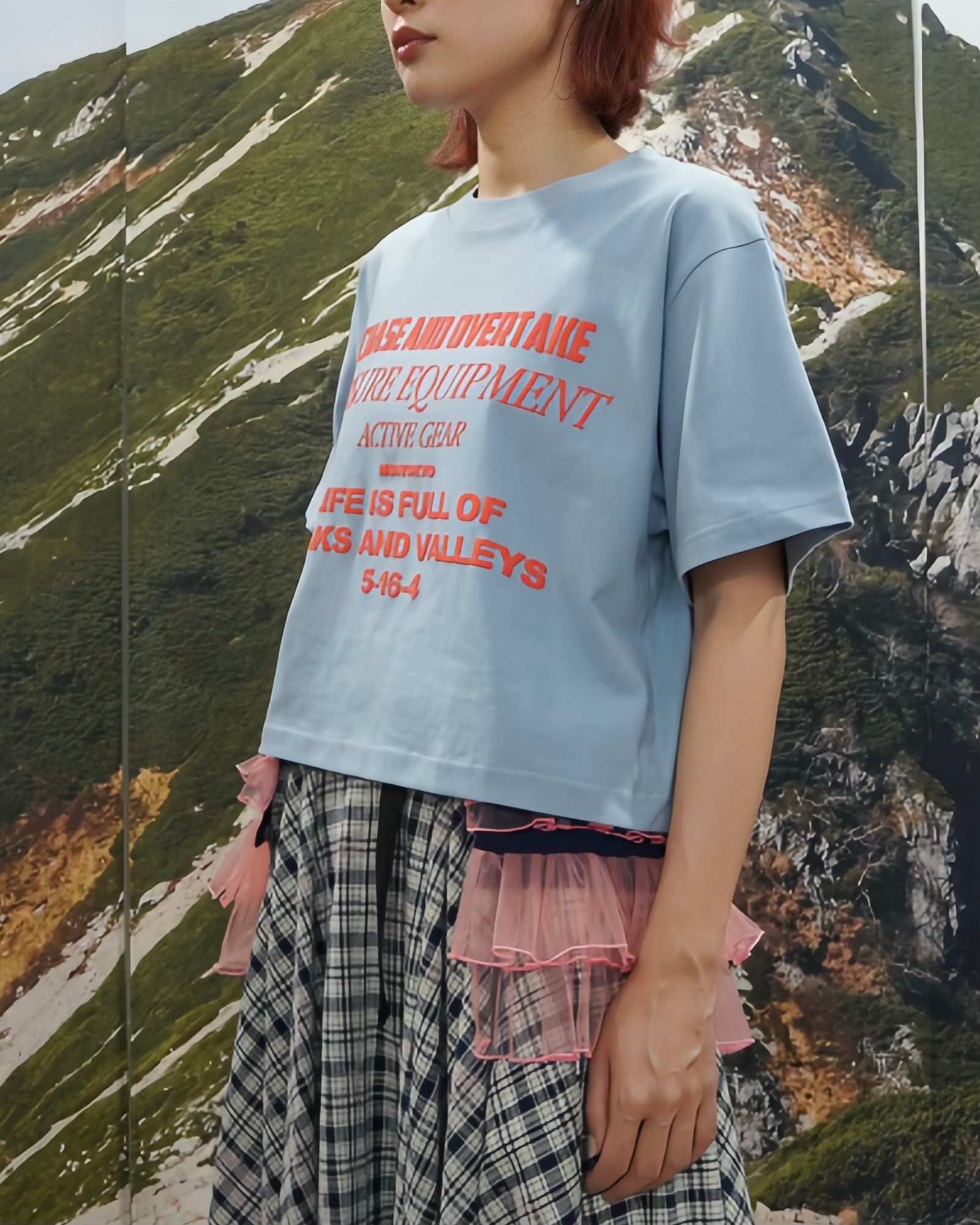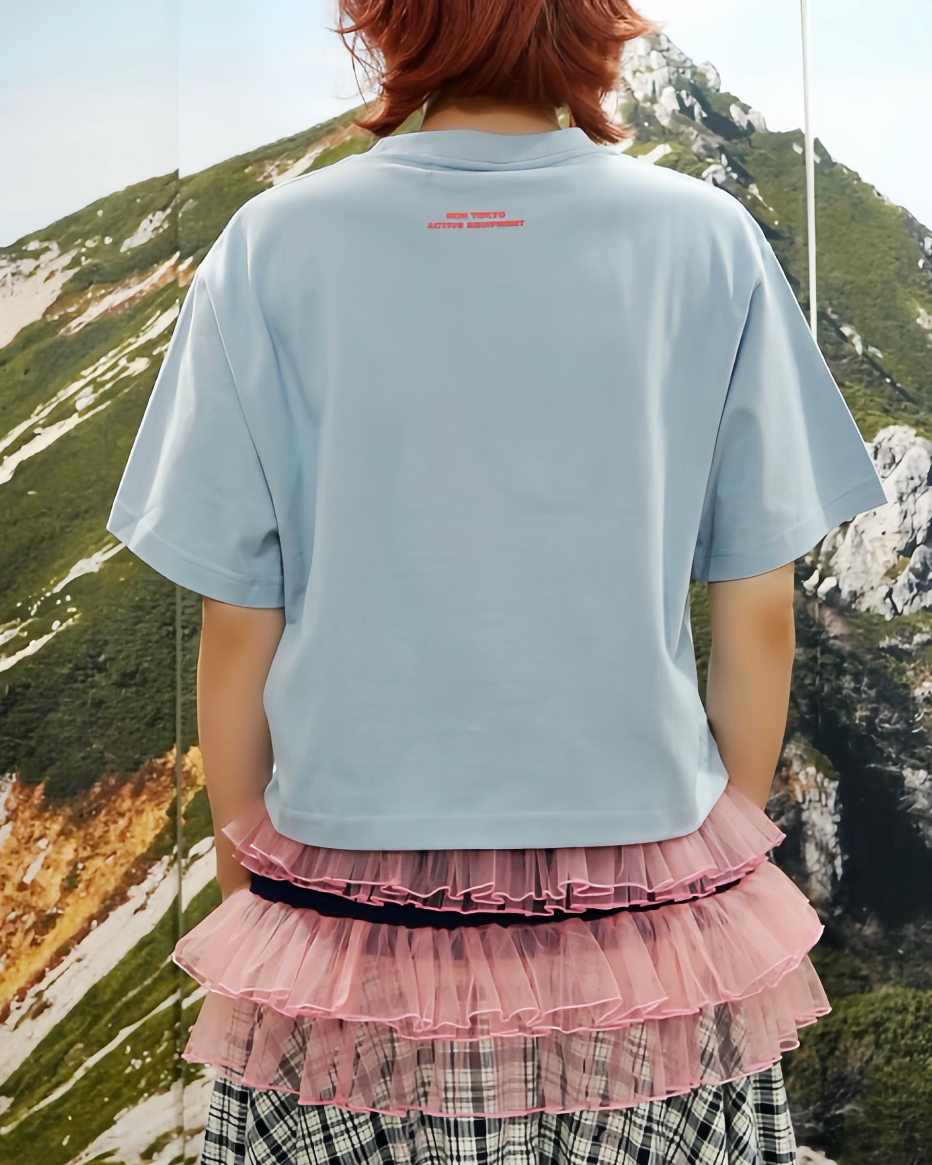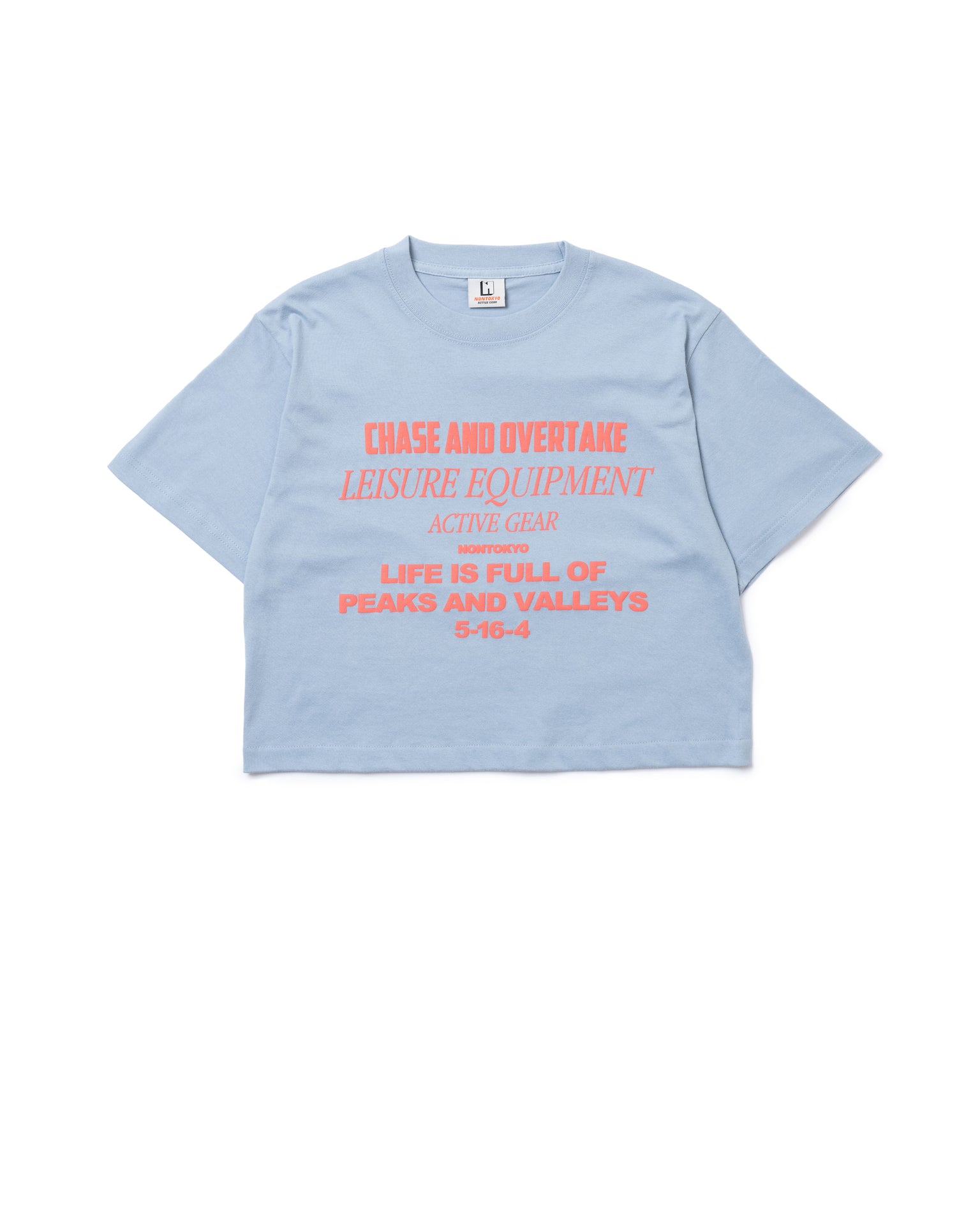 オリジナルグラフィックがプリントされたショート丈の半袖 Tシャツ。