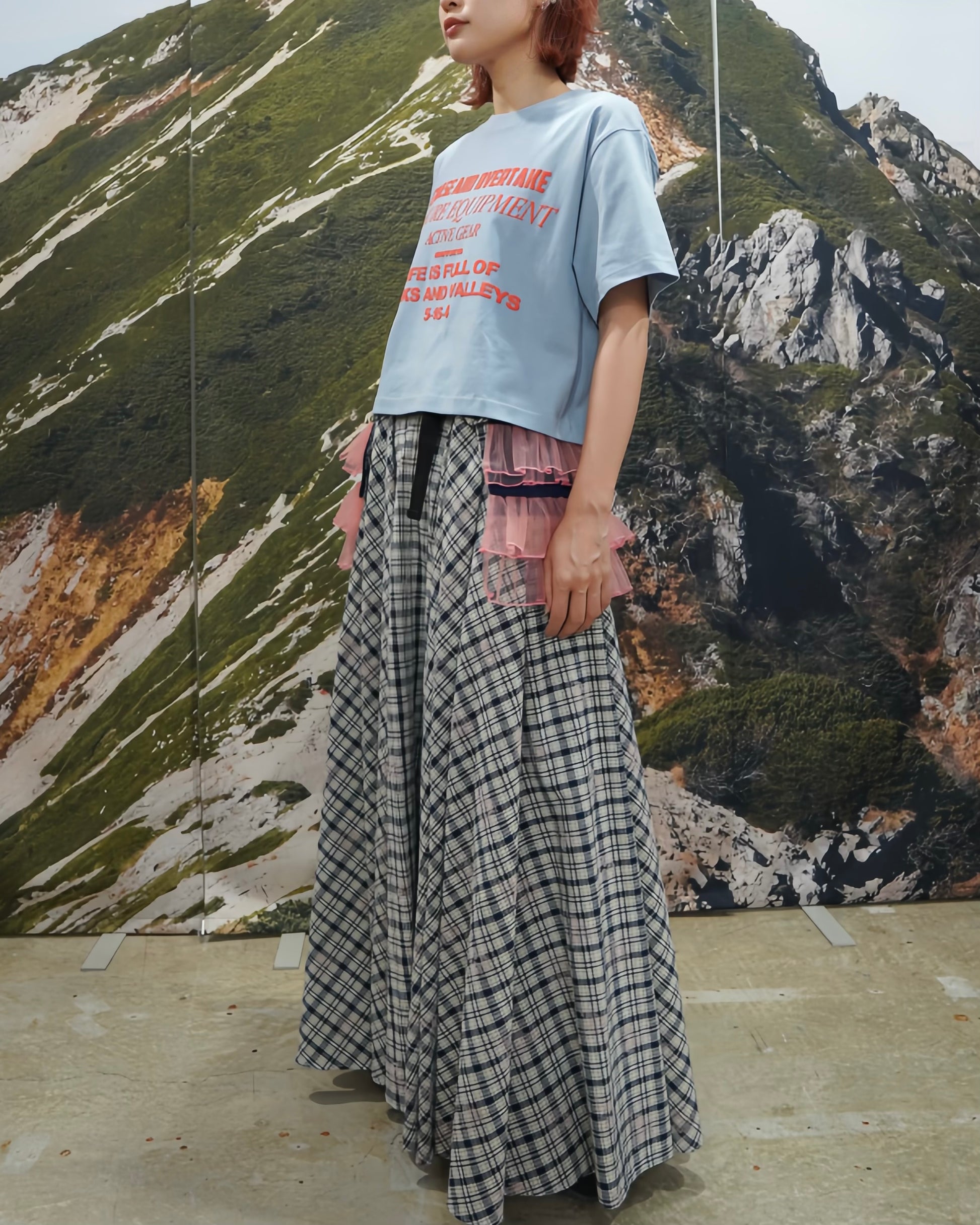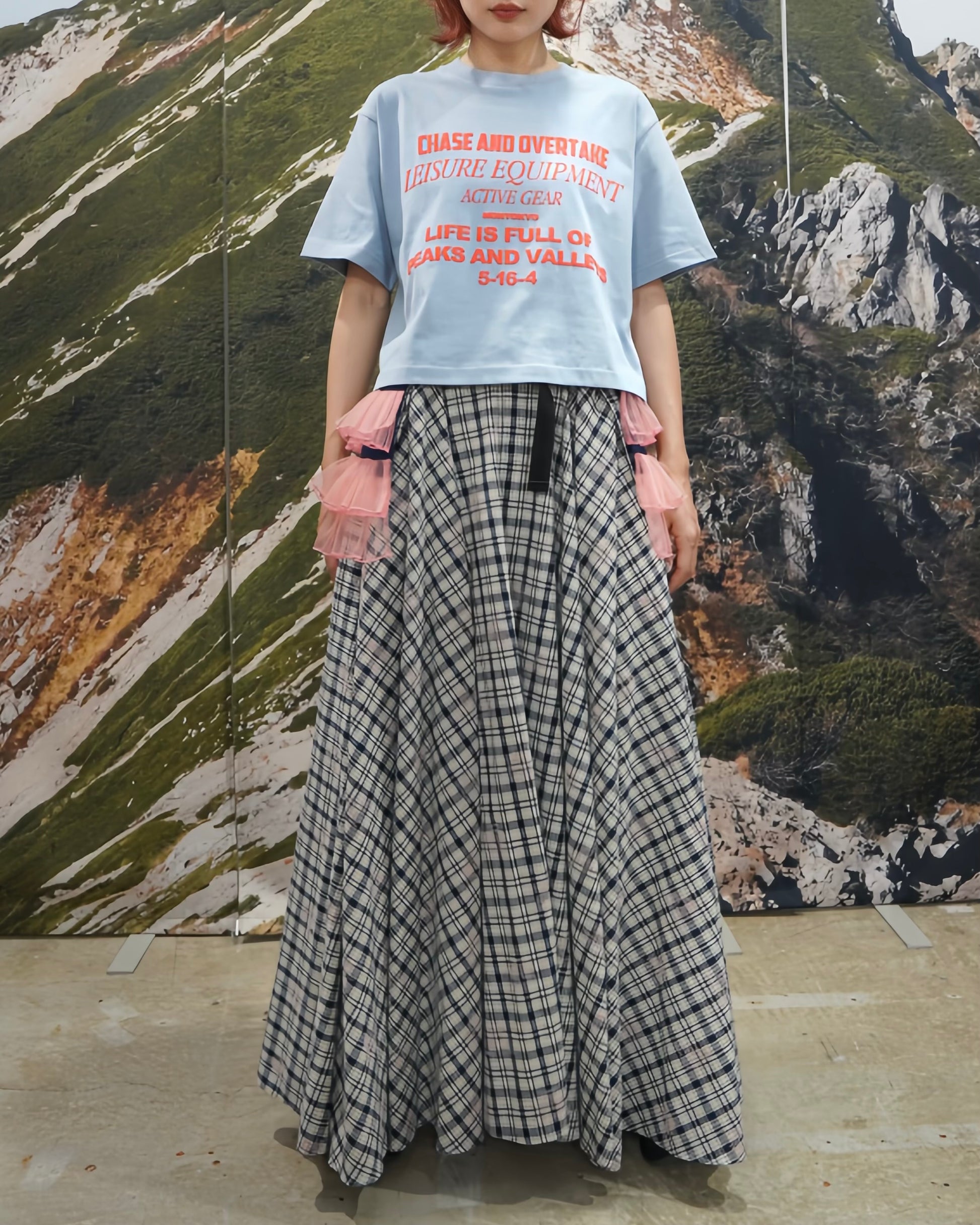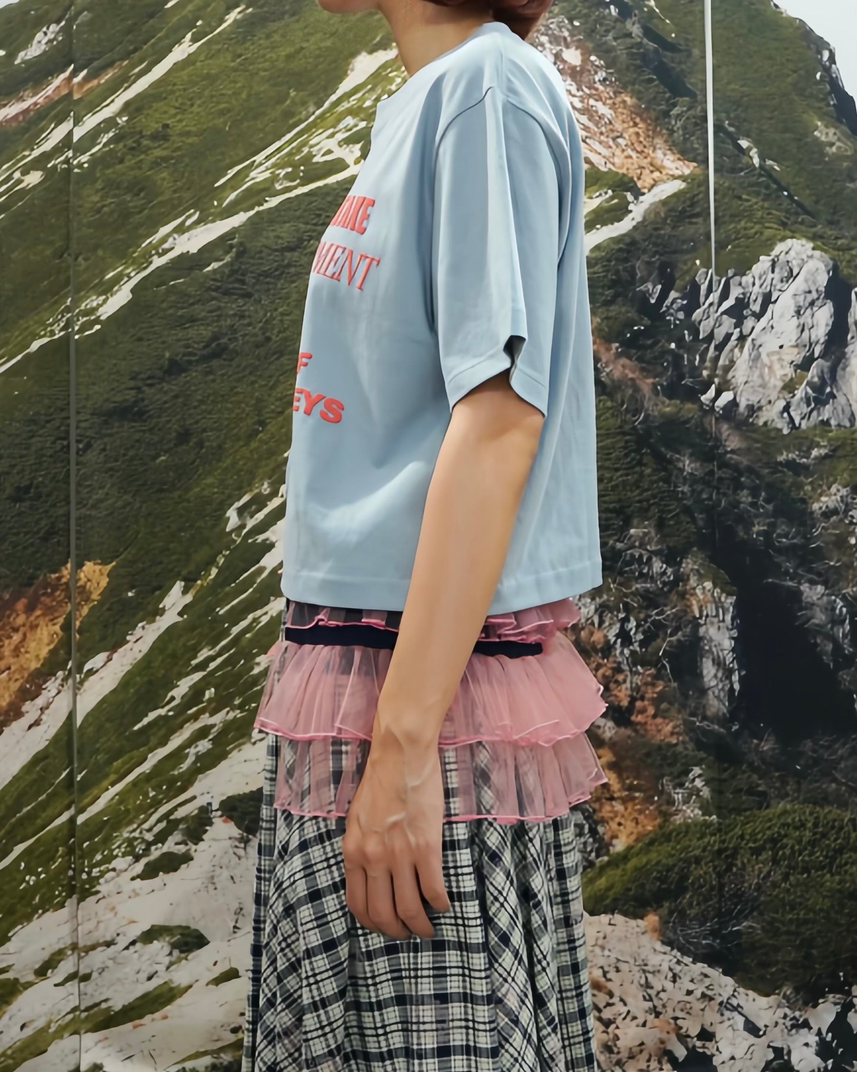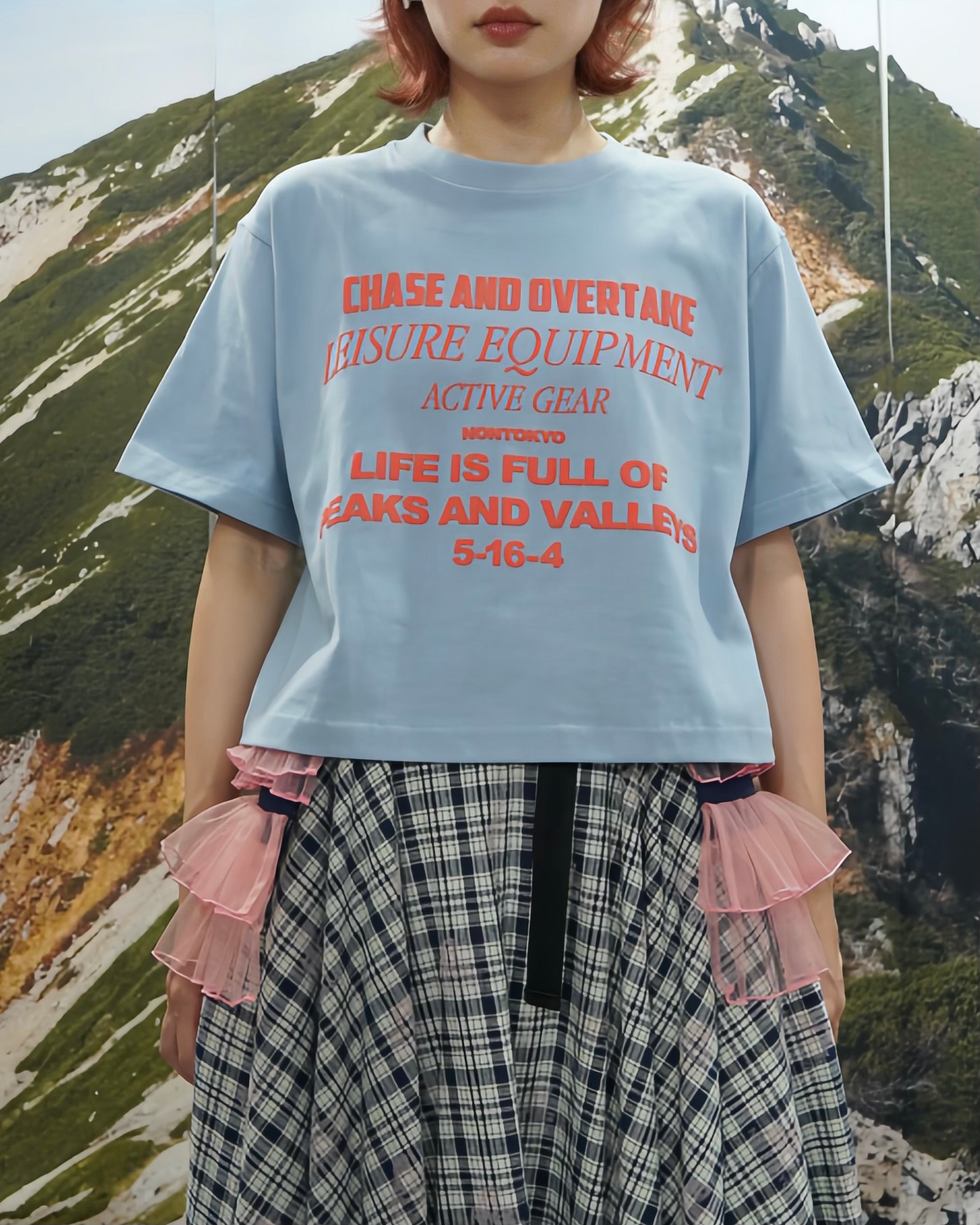 オリジナルグラフィックがプリントされたショート丈の半袖 Tシャツ。