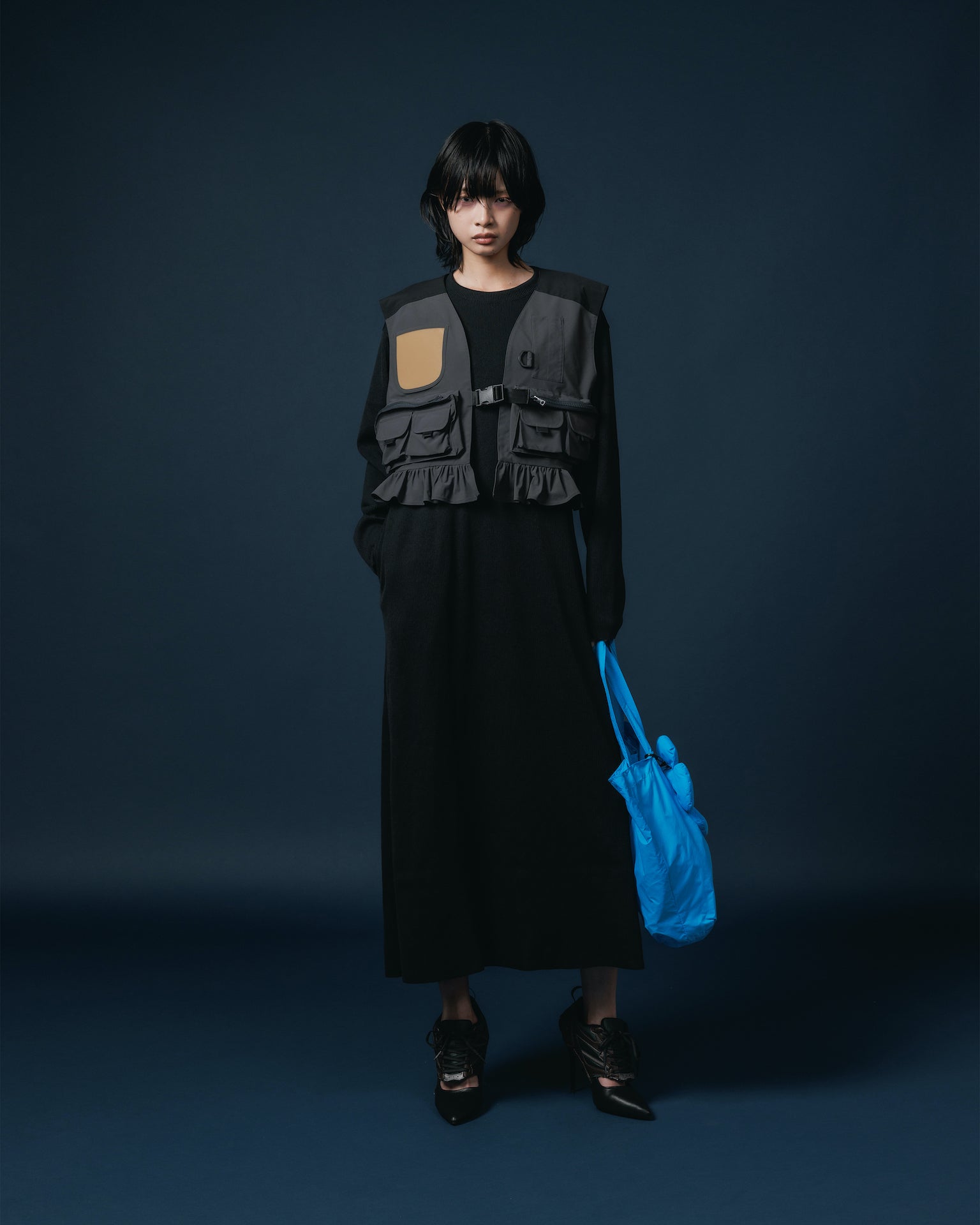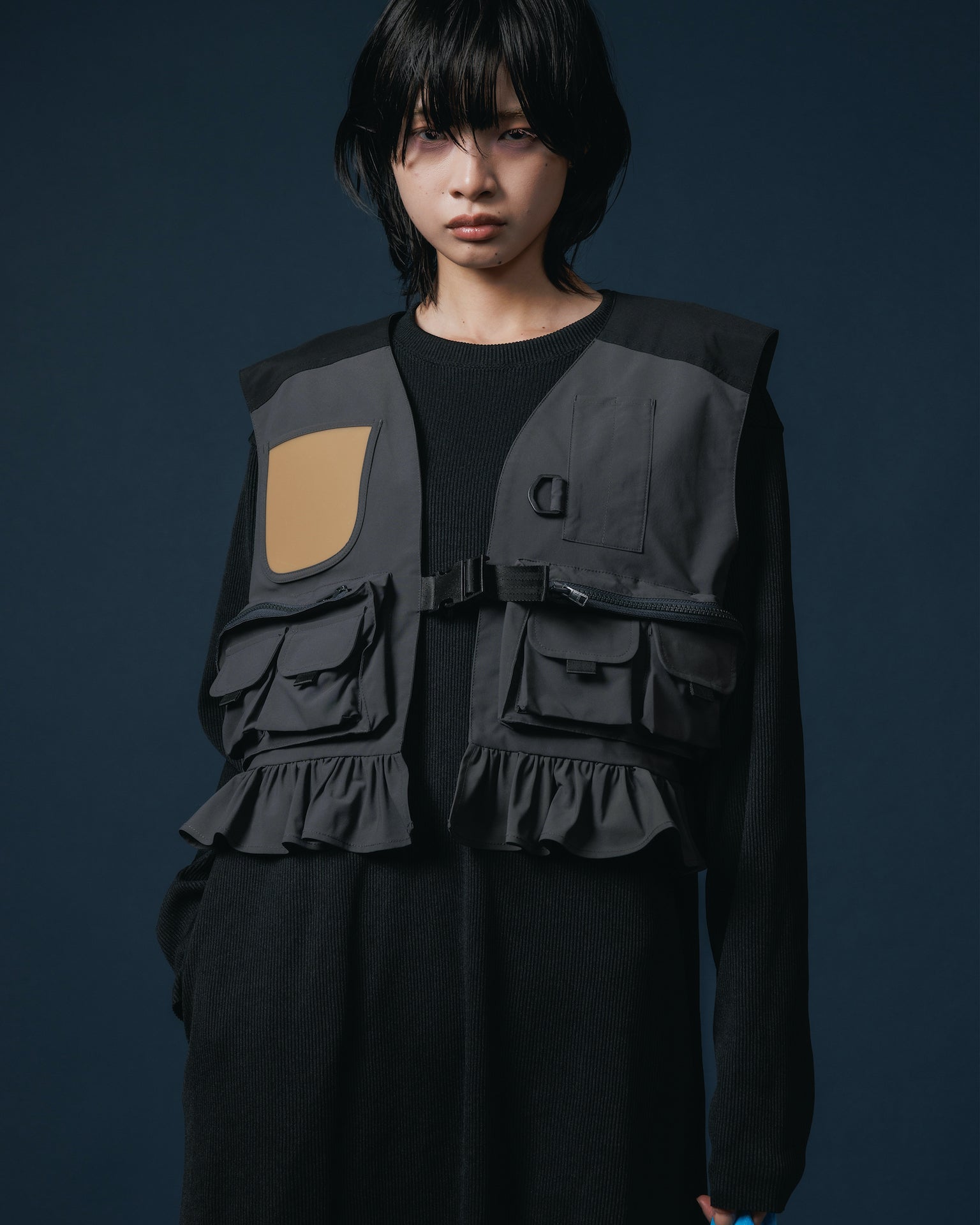 裾にフリルがあしらわれたショート丈のフィッシングベスト。