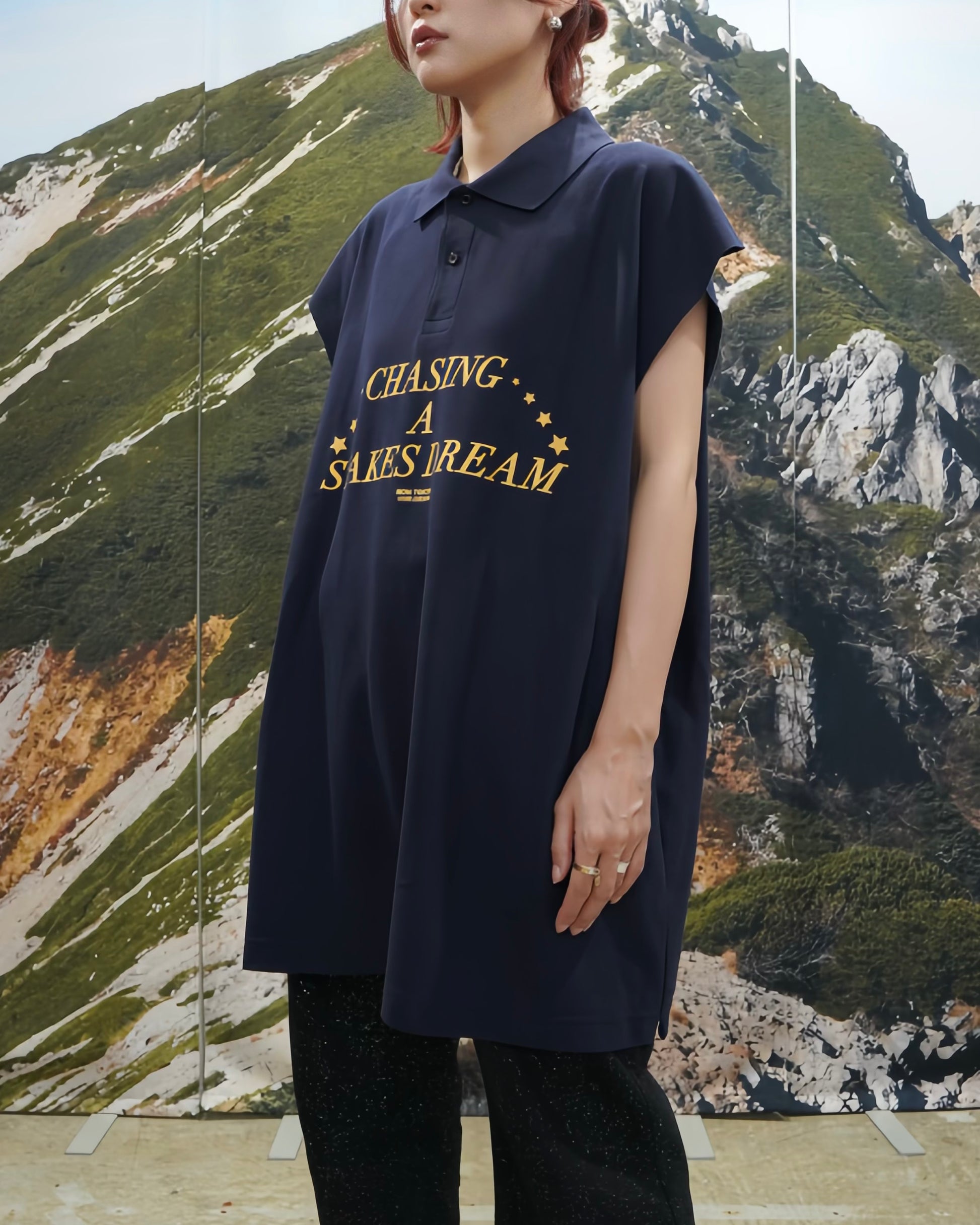 フロントに今期のテーマがプリントされたノースリーブのポロシャツ。