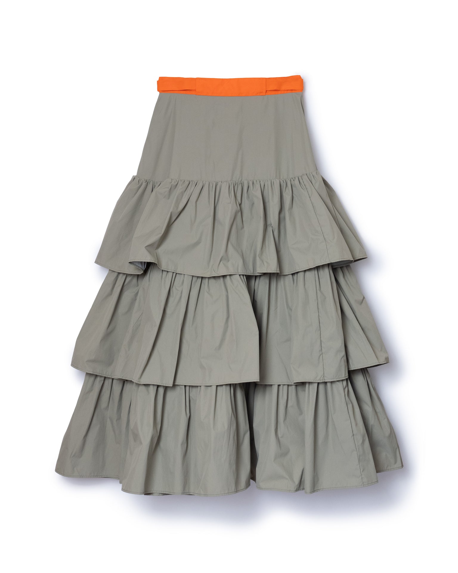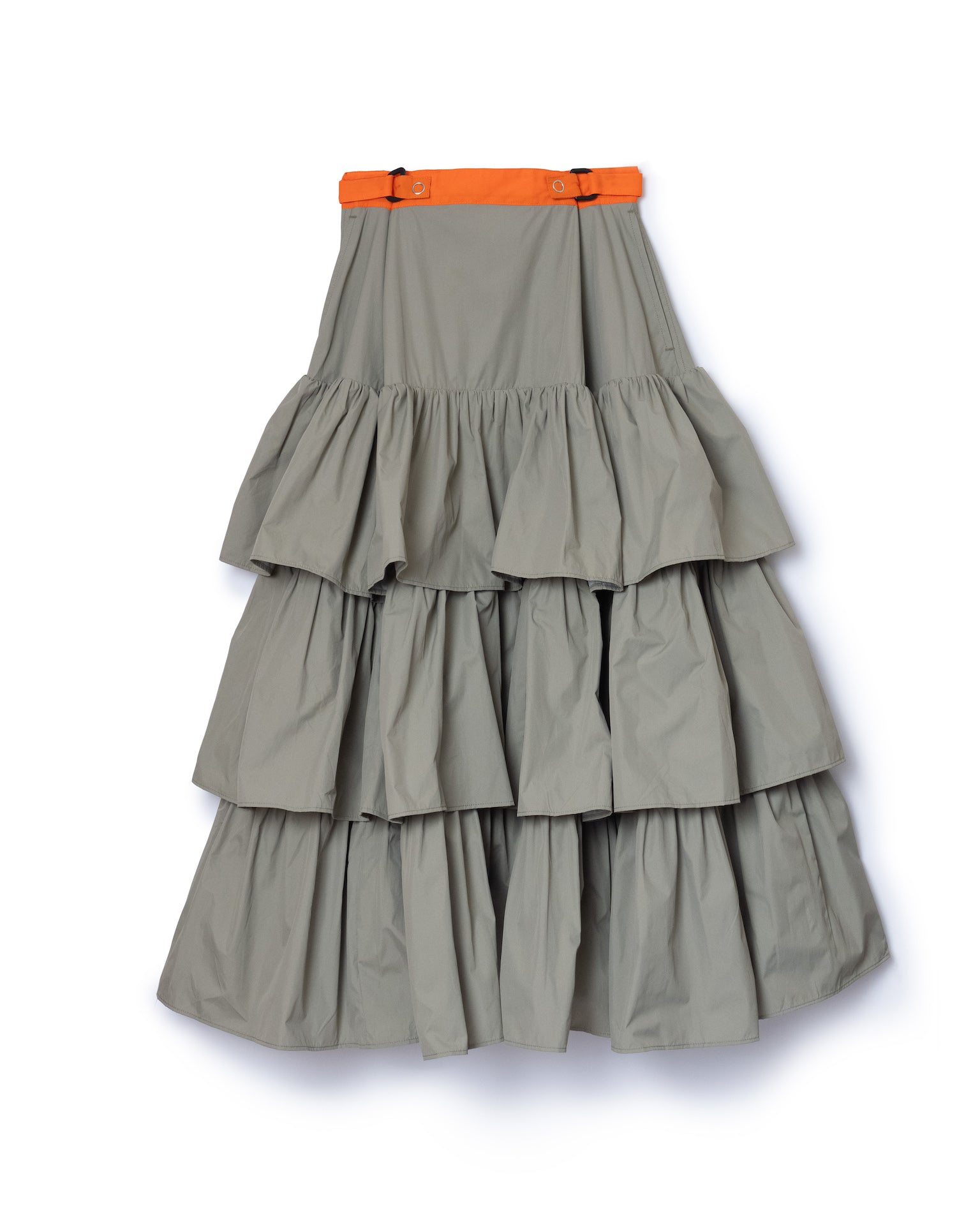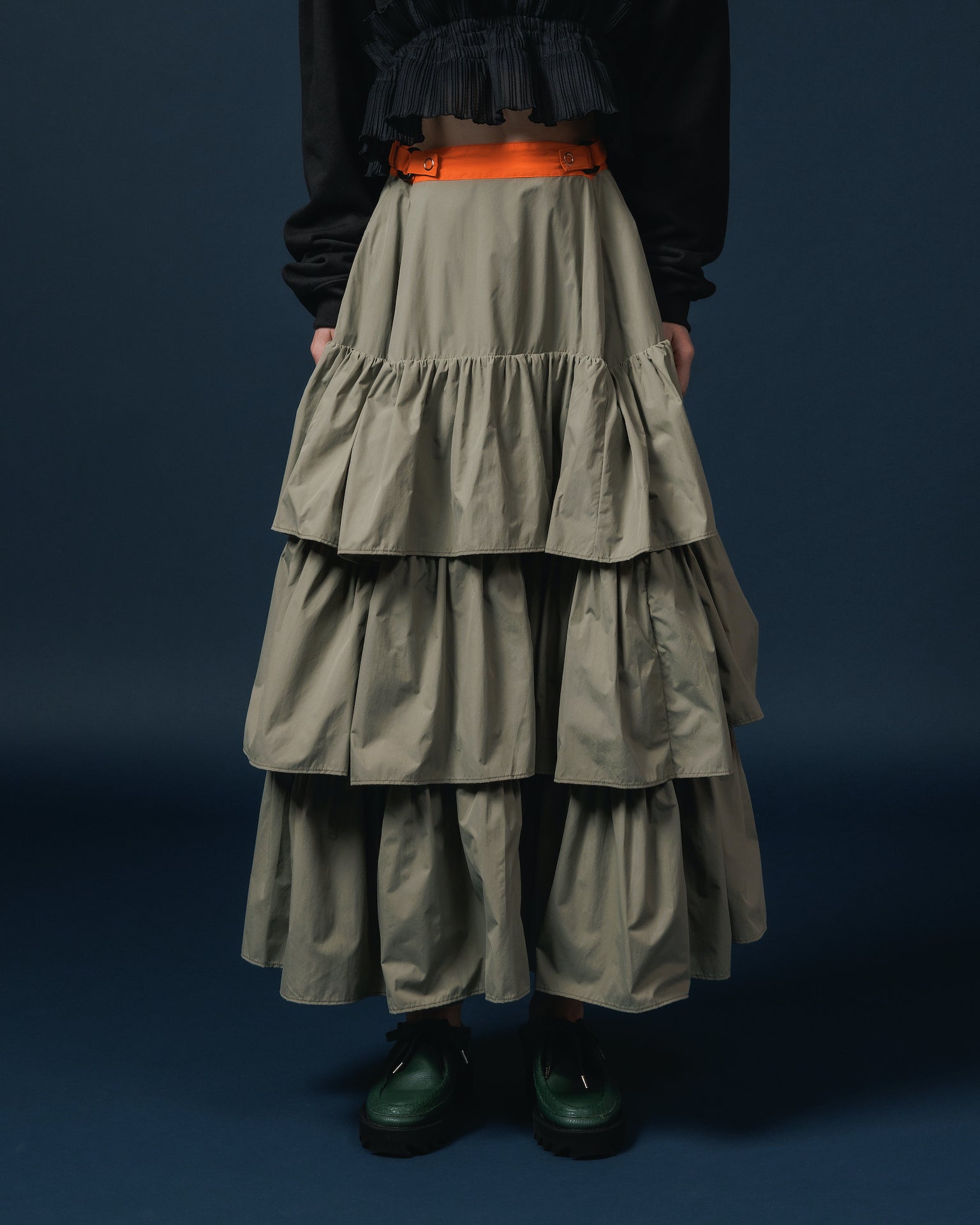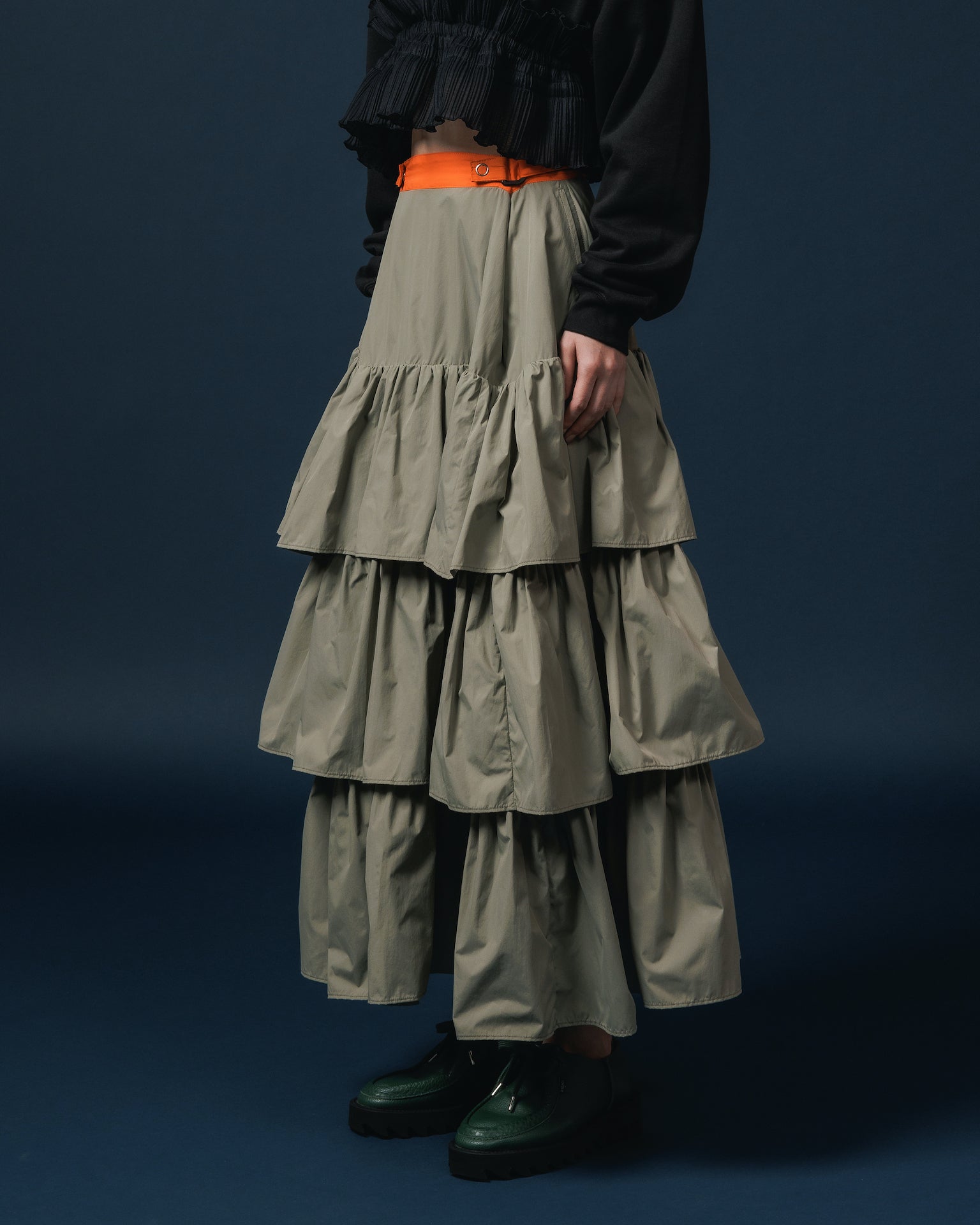 たっぷりギャザーが入ったナイロン素材のティアードスカート。