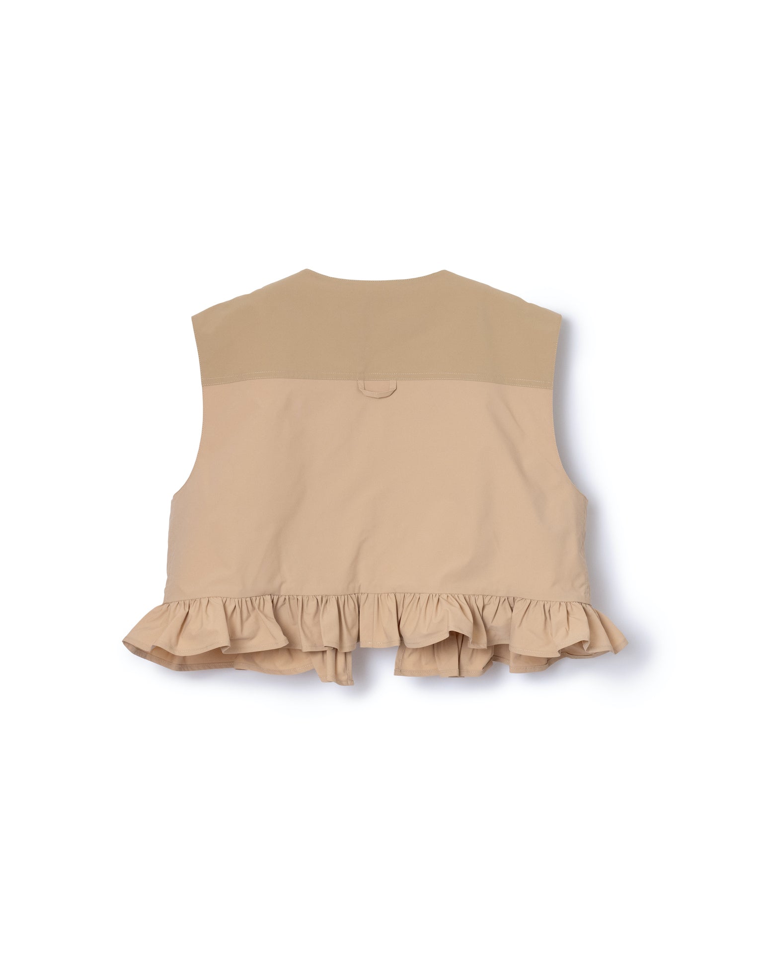 裾にフリルがあしらわれたショート丈のフィッシングベスト。