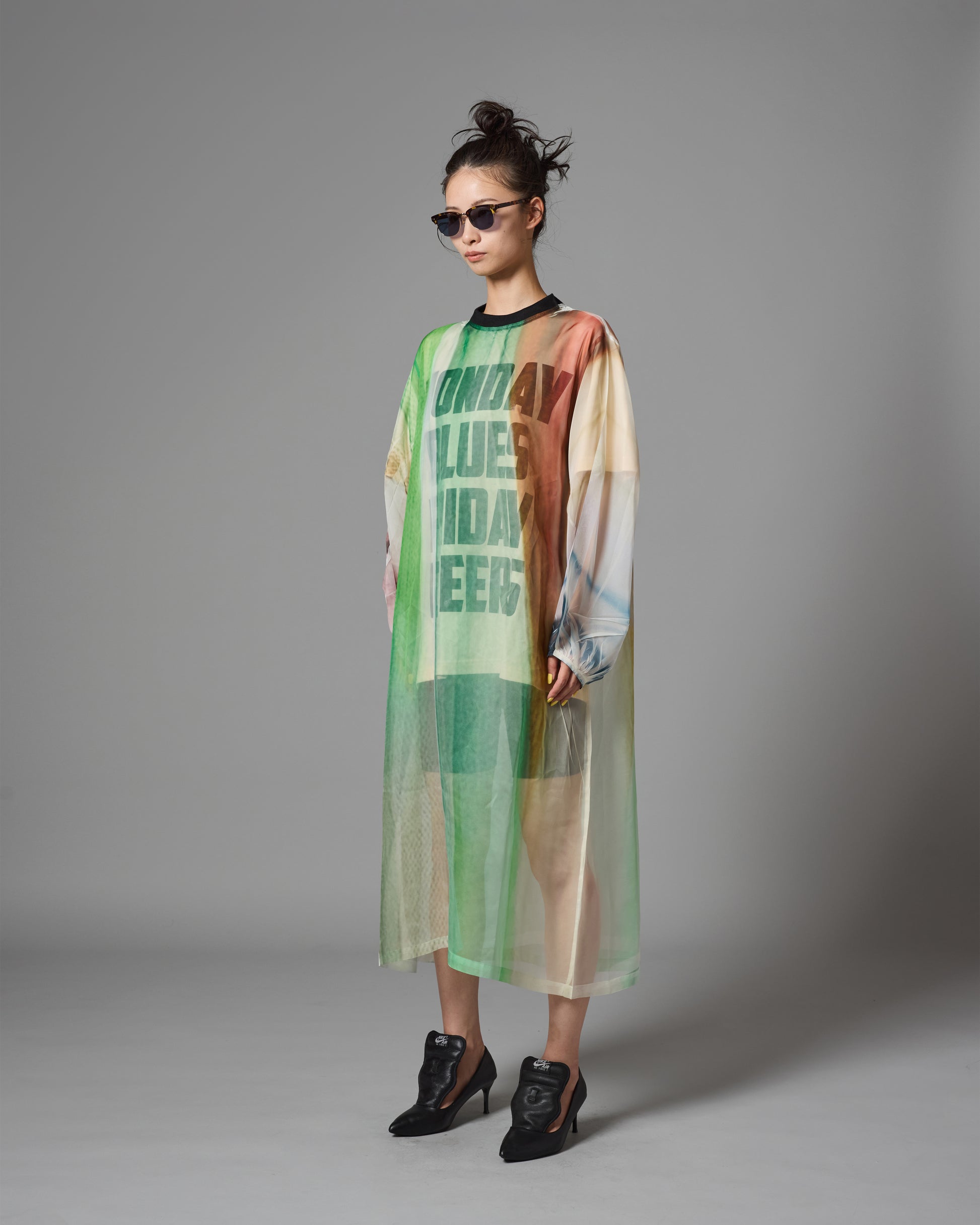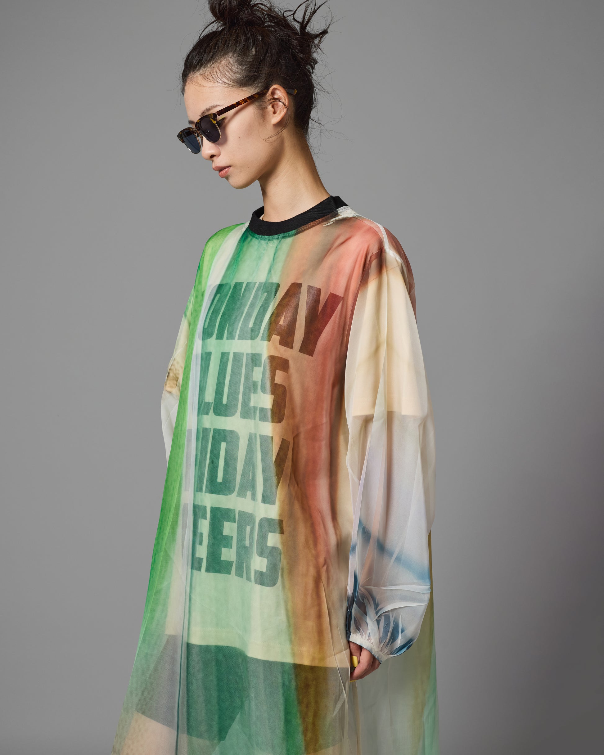 シアー素材にプリントが入ったプルオーバーワンピース。