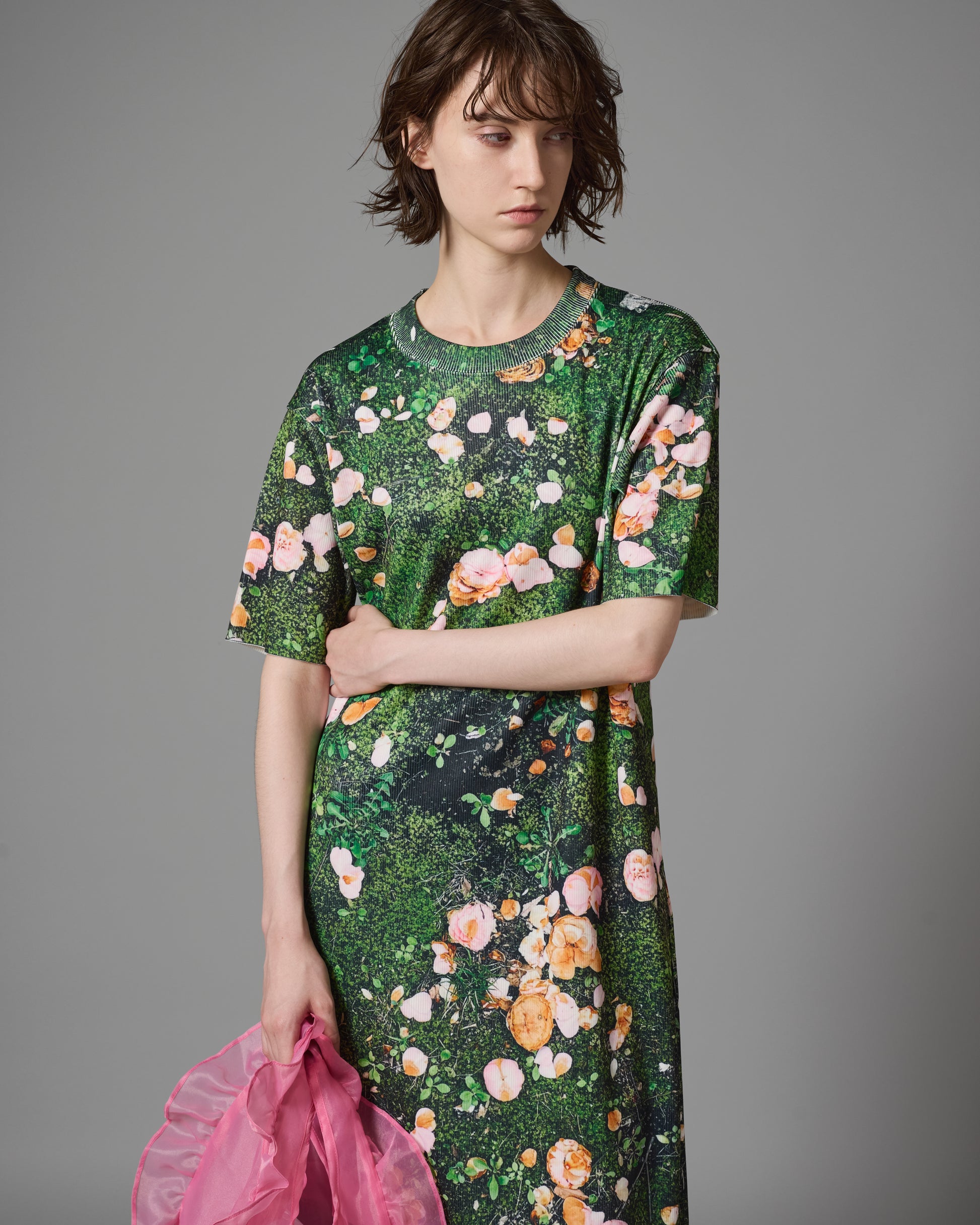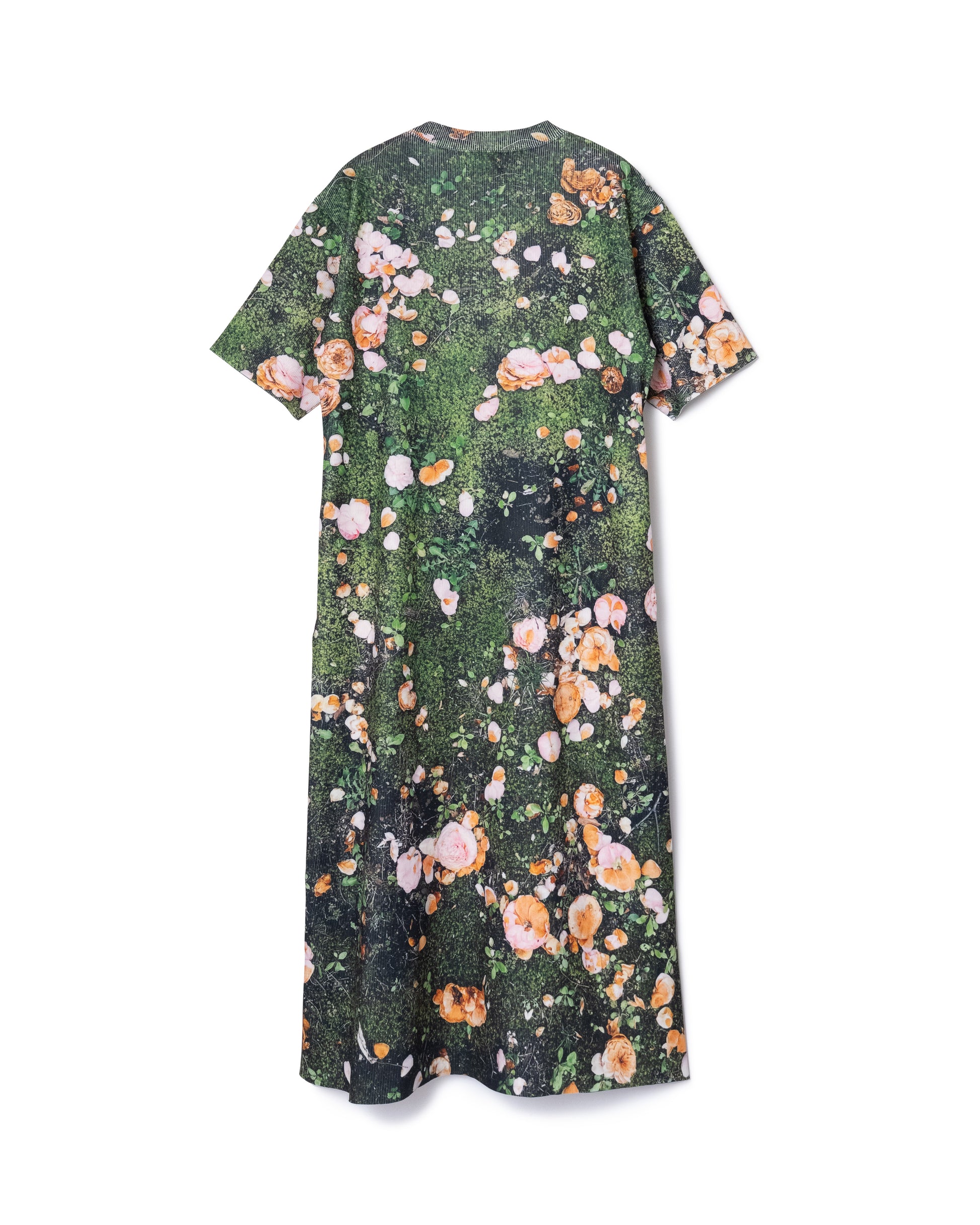 ハリとコシのあるリブを使用したクルーネックの半袖プリントワンピース。
