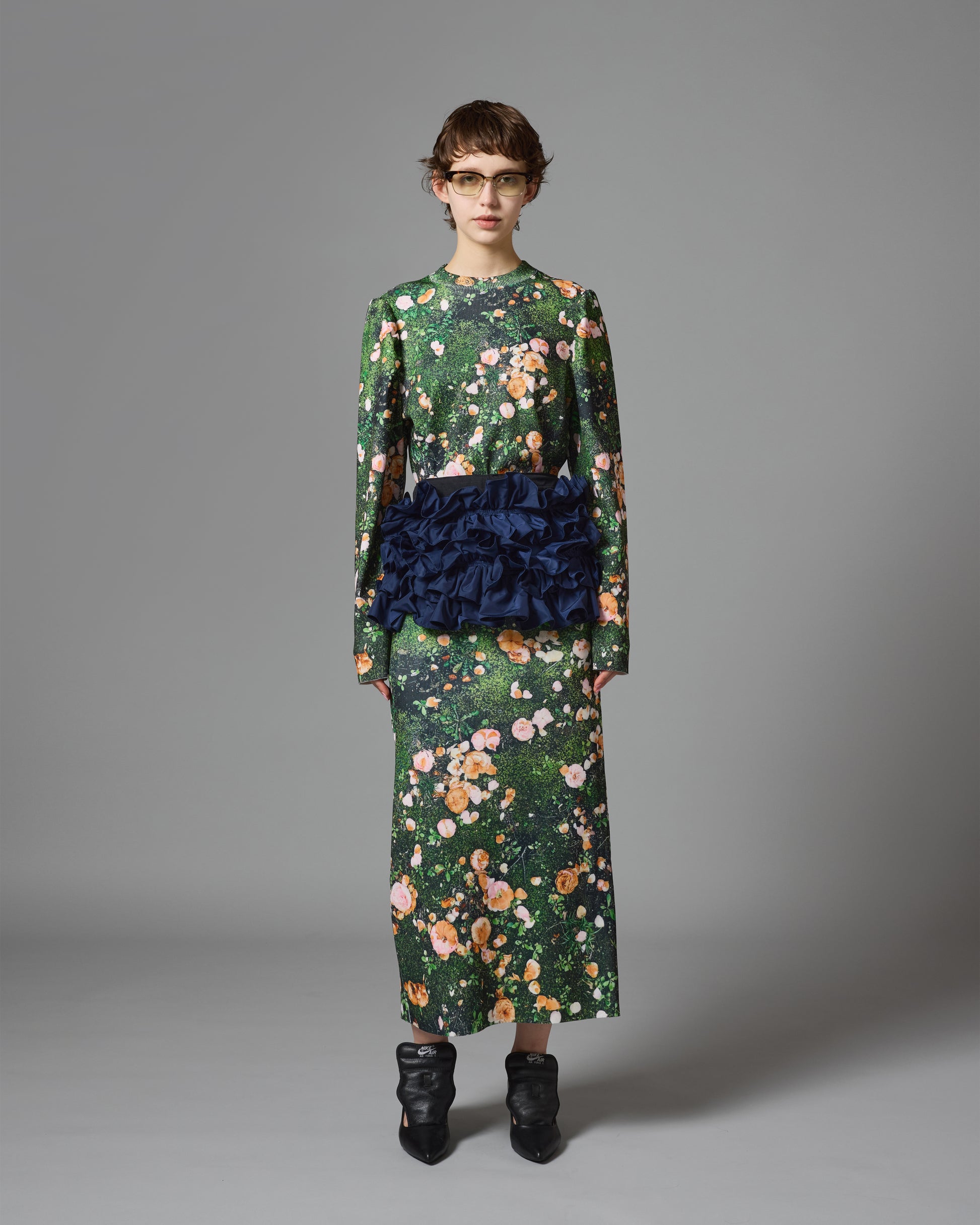 ハリとコシのあるリブを使用したプリントタイトスカート。