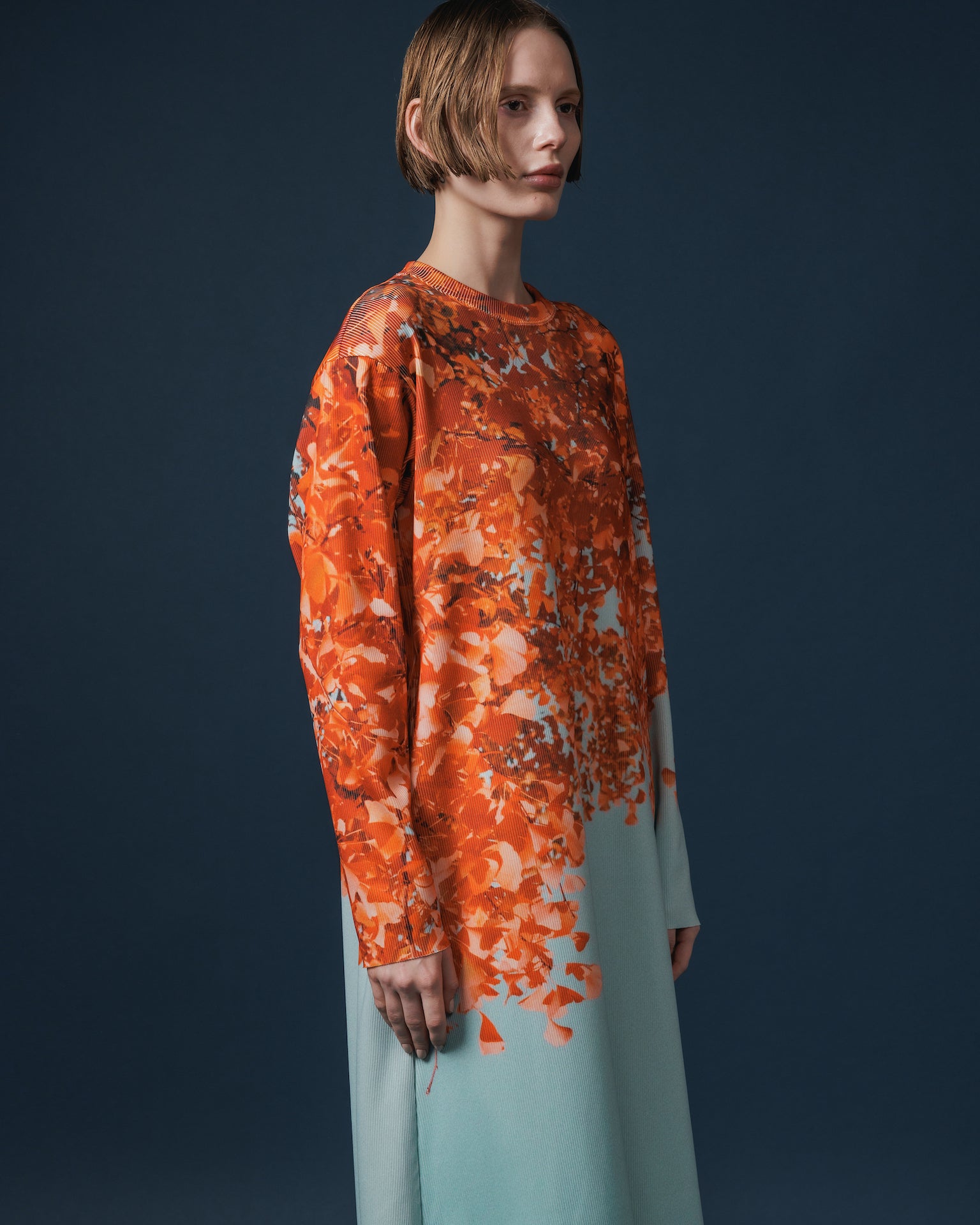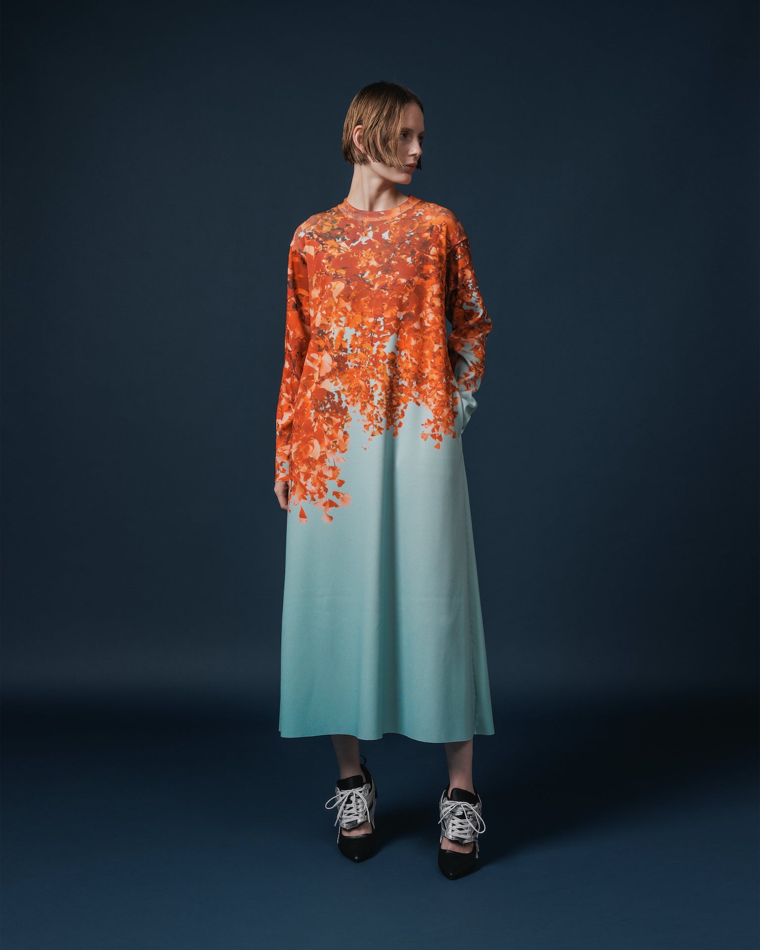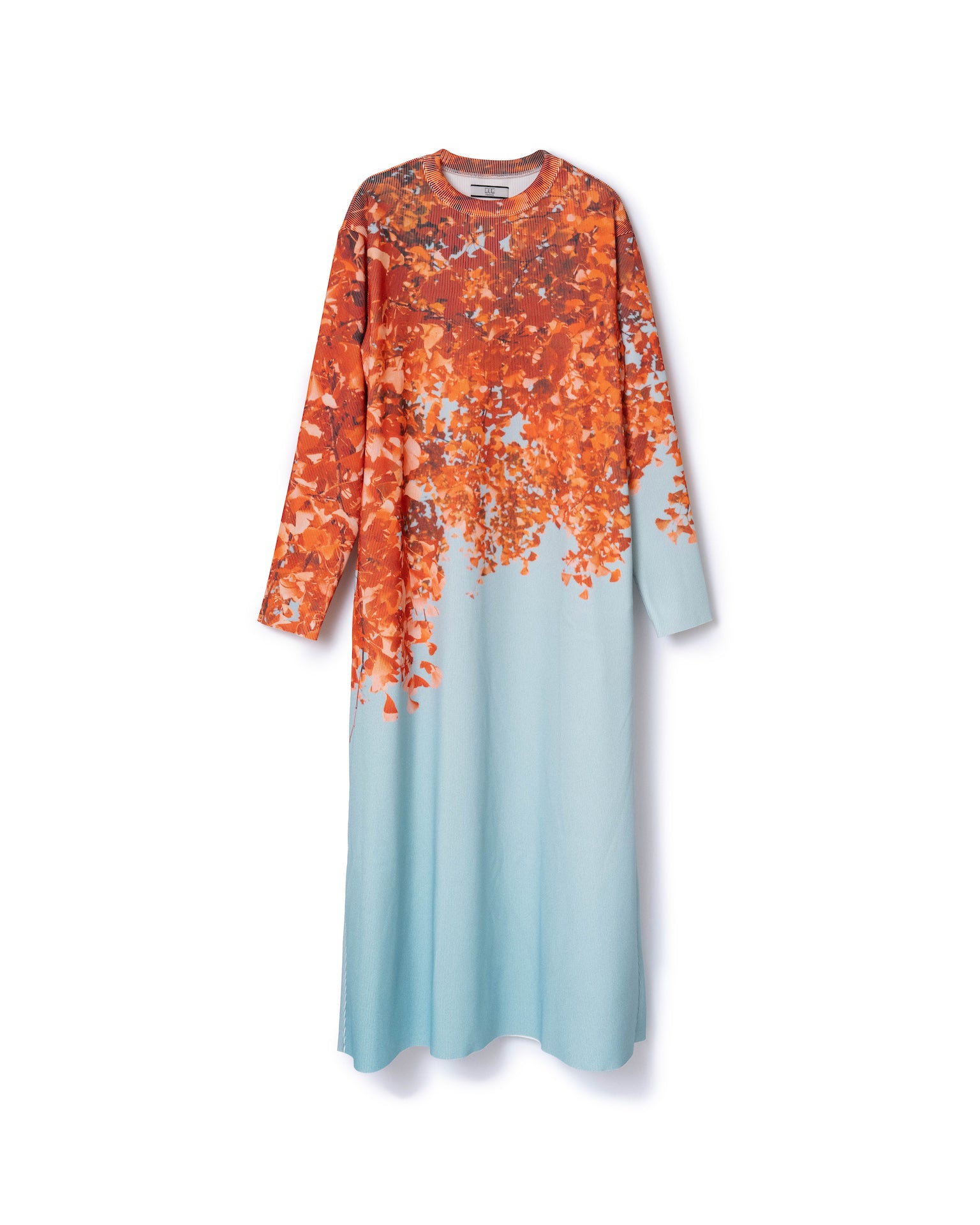 ハリとコシのあるリブを使用したクルーネックの長袖プリントワンピース。