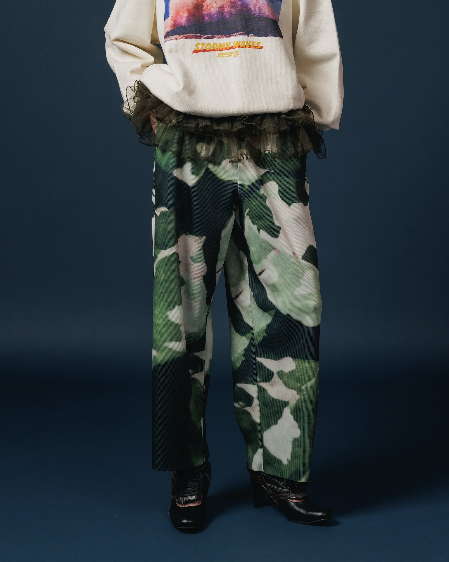 ハリとコシのあるリブを使用したワイドシルエットのプリントパンツ。