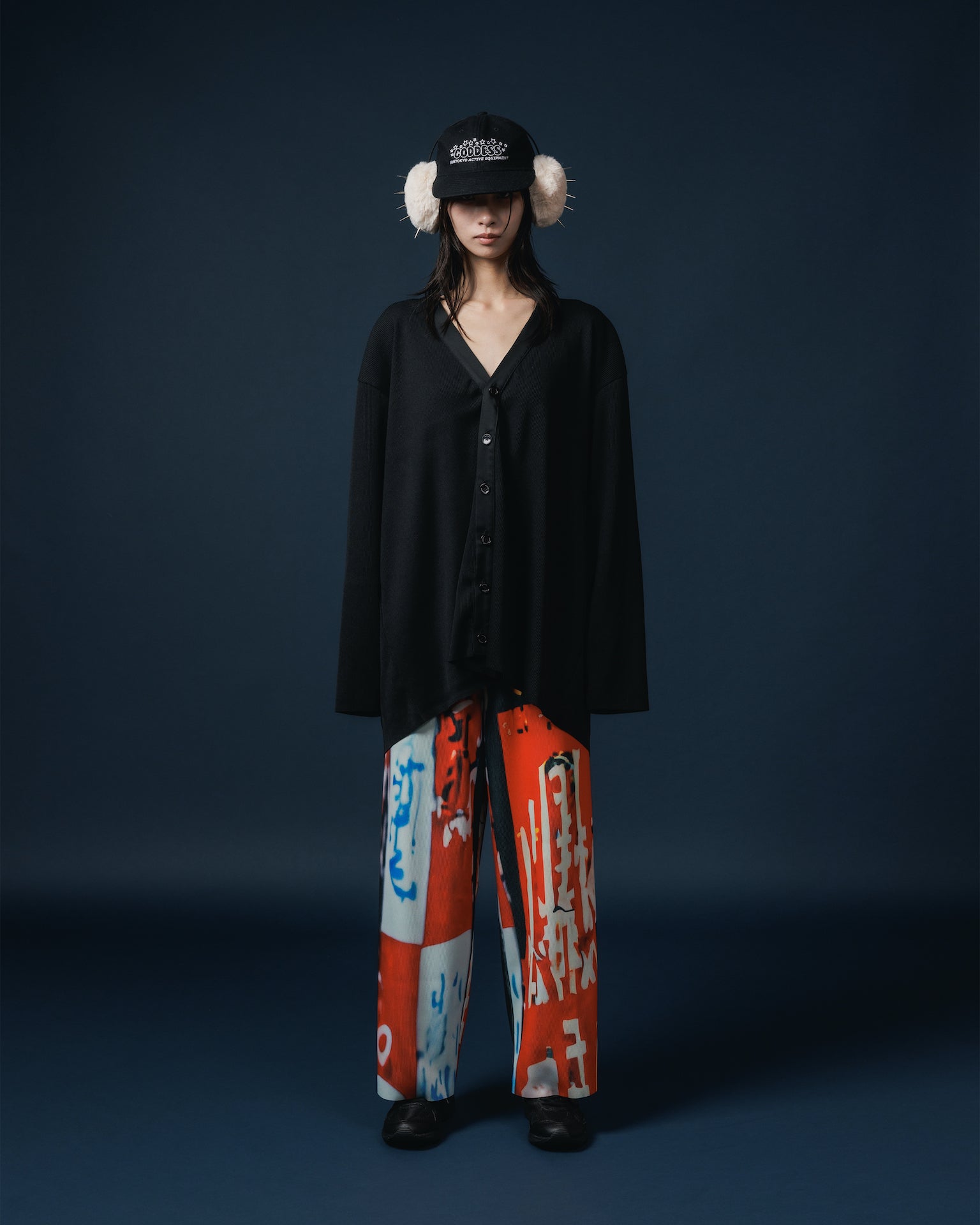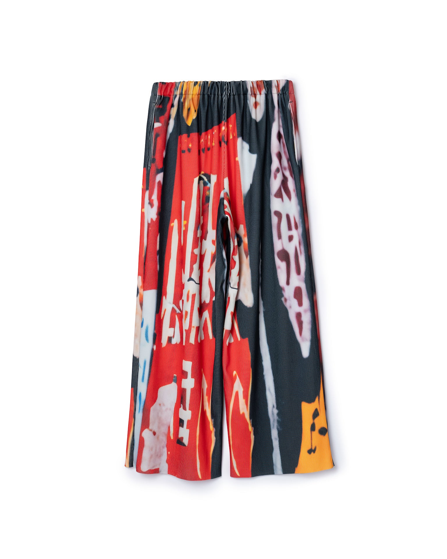 ハリとコシのあるリブを使用したワイドシルエットのプリントパンツ。