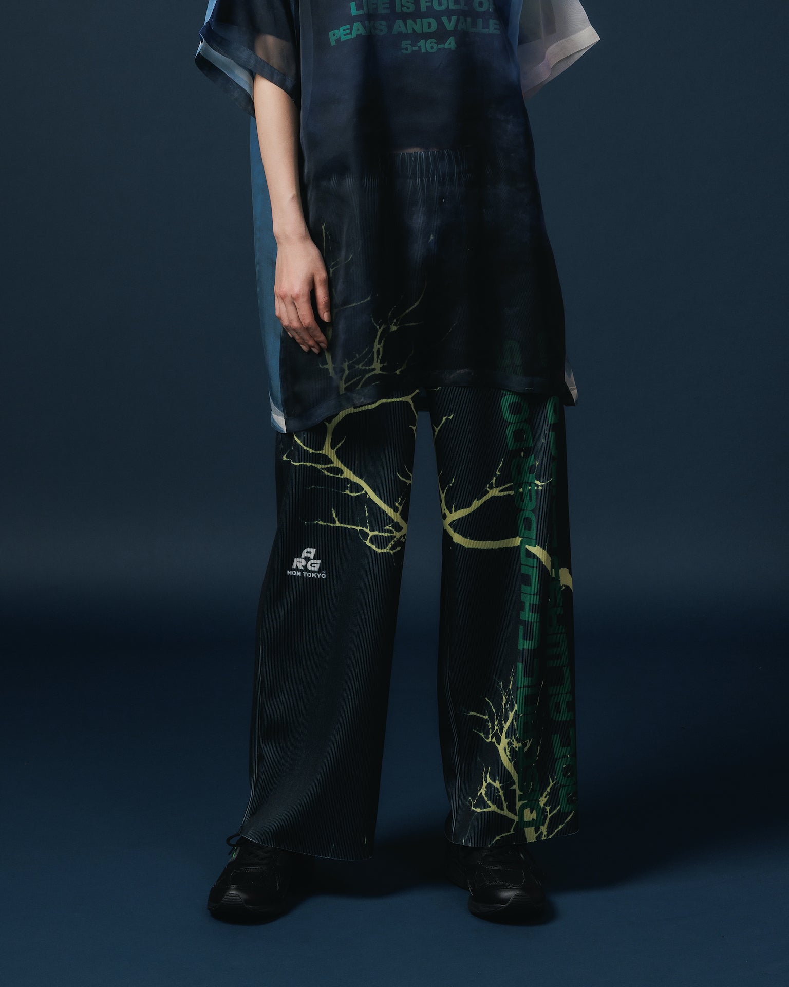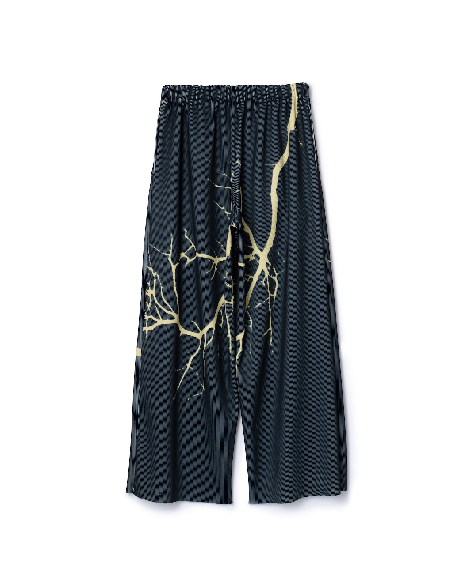 ハリとコシのあるリブを使用したワイドシルエットのプリントパンツ。