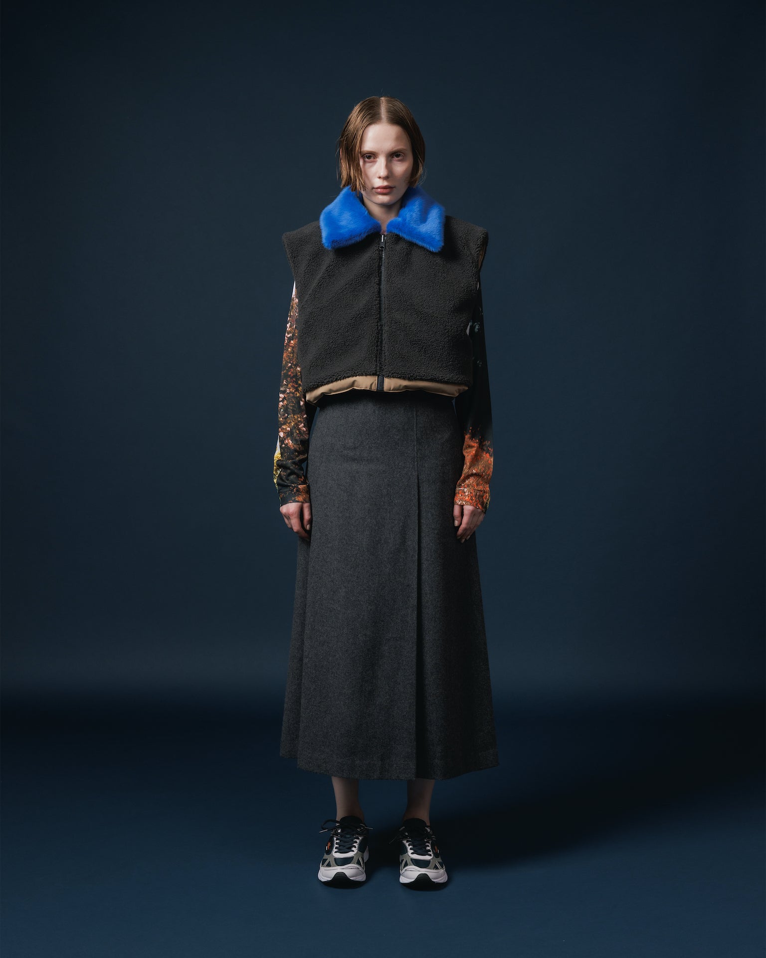 ドンキージャケットをショート丈にした様なデザインと、カラーファーの襟と身頃の配色が特徴です。