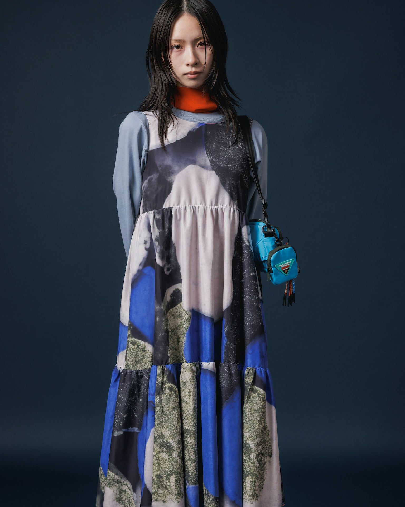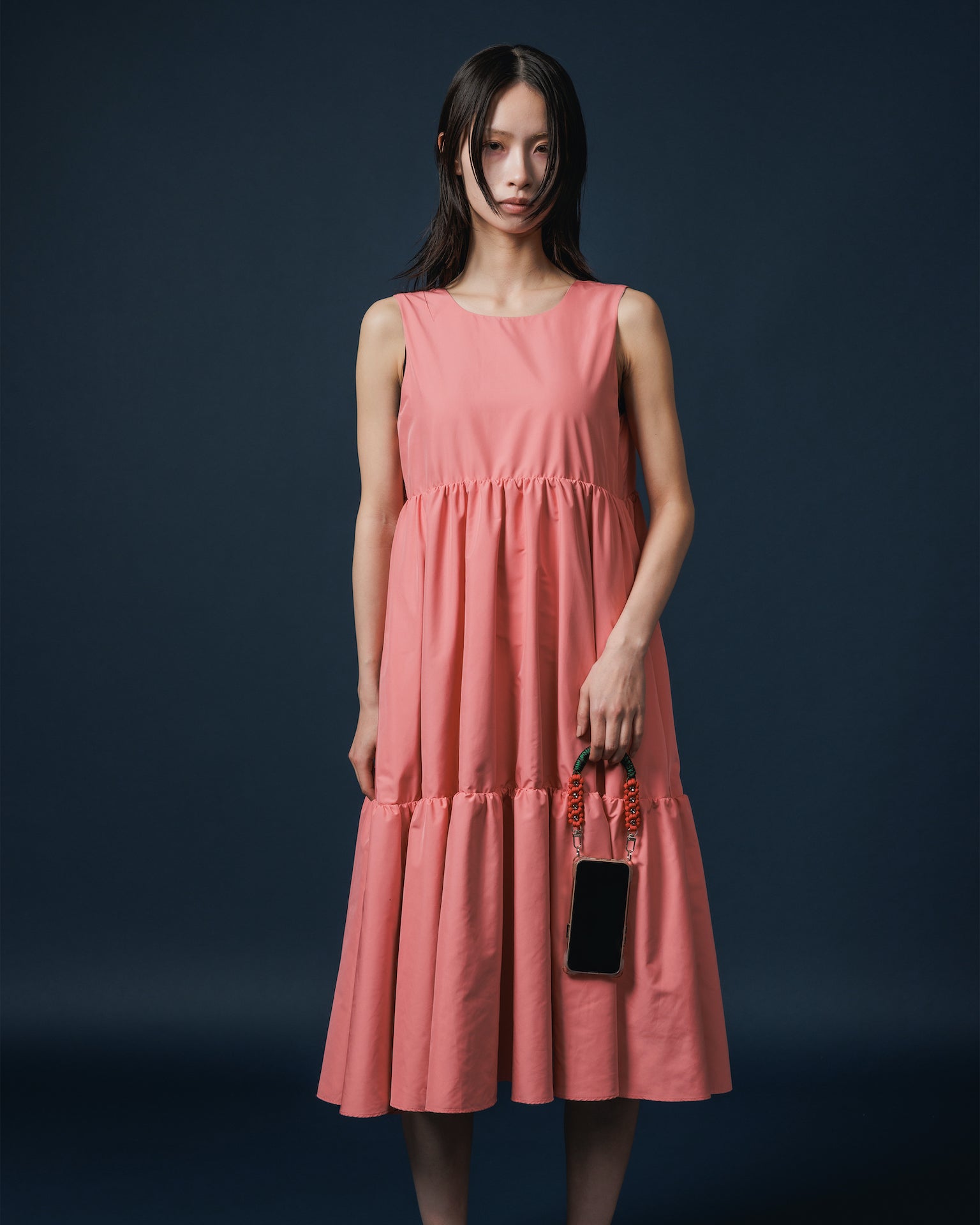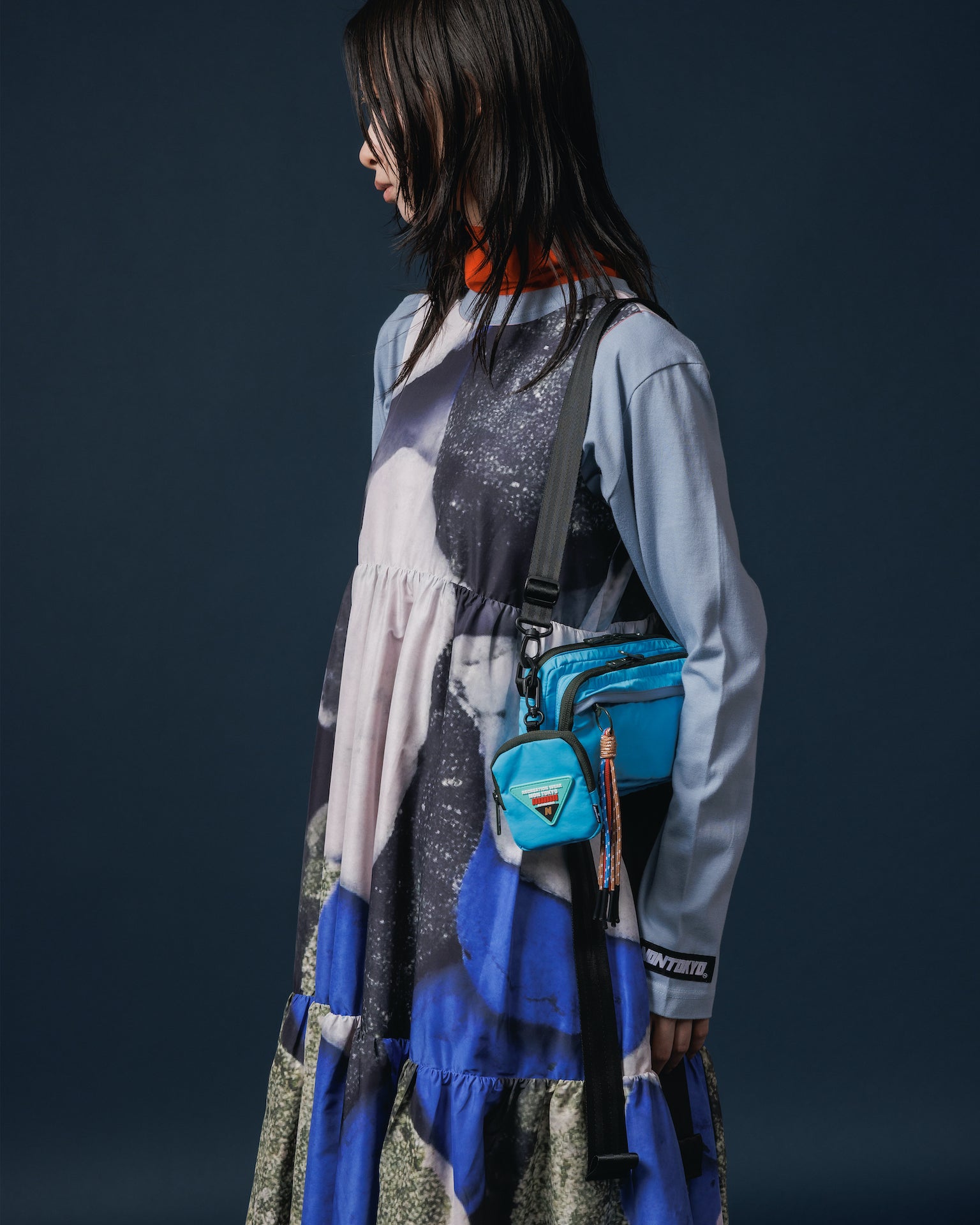 身頃にはギャザーがたっぷり入っていますが、薄手の軽量ナイロンを用いているので重さを感じず、柔らかい質感で着心地が良いです。