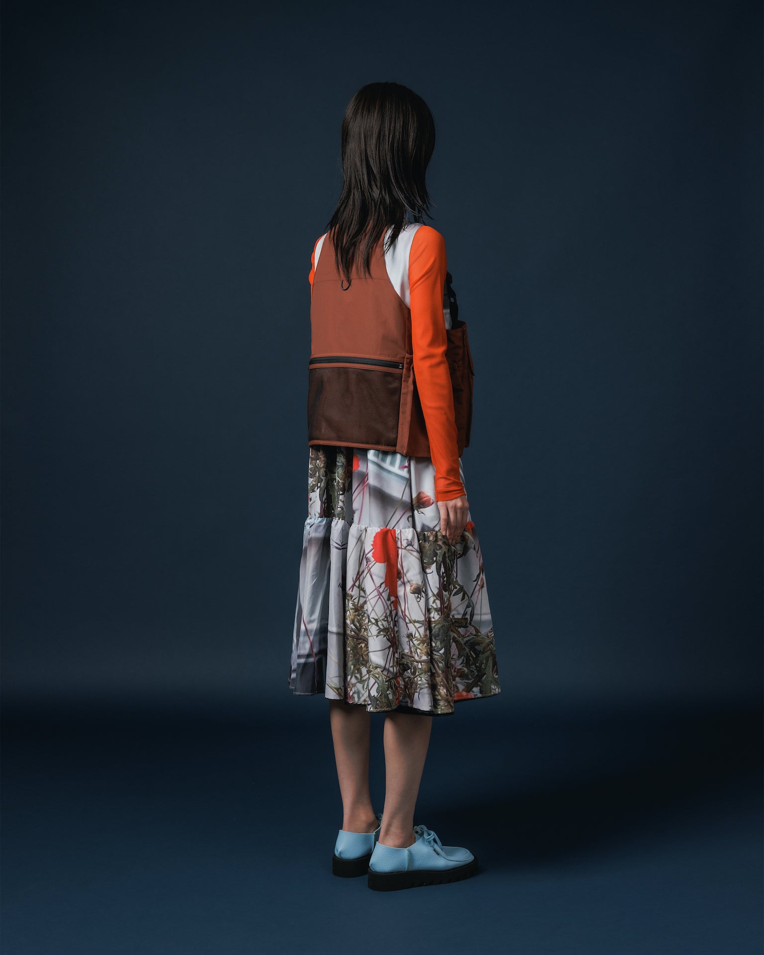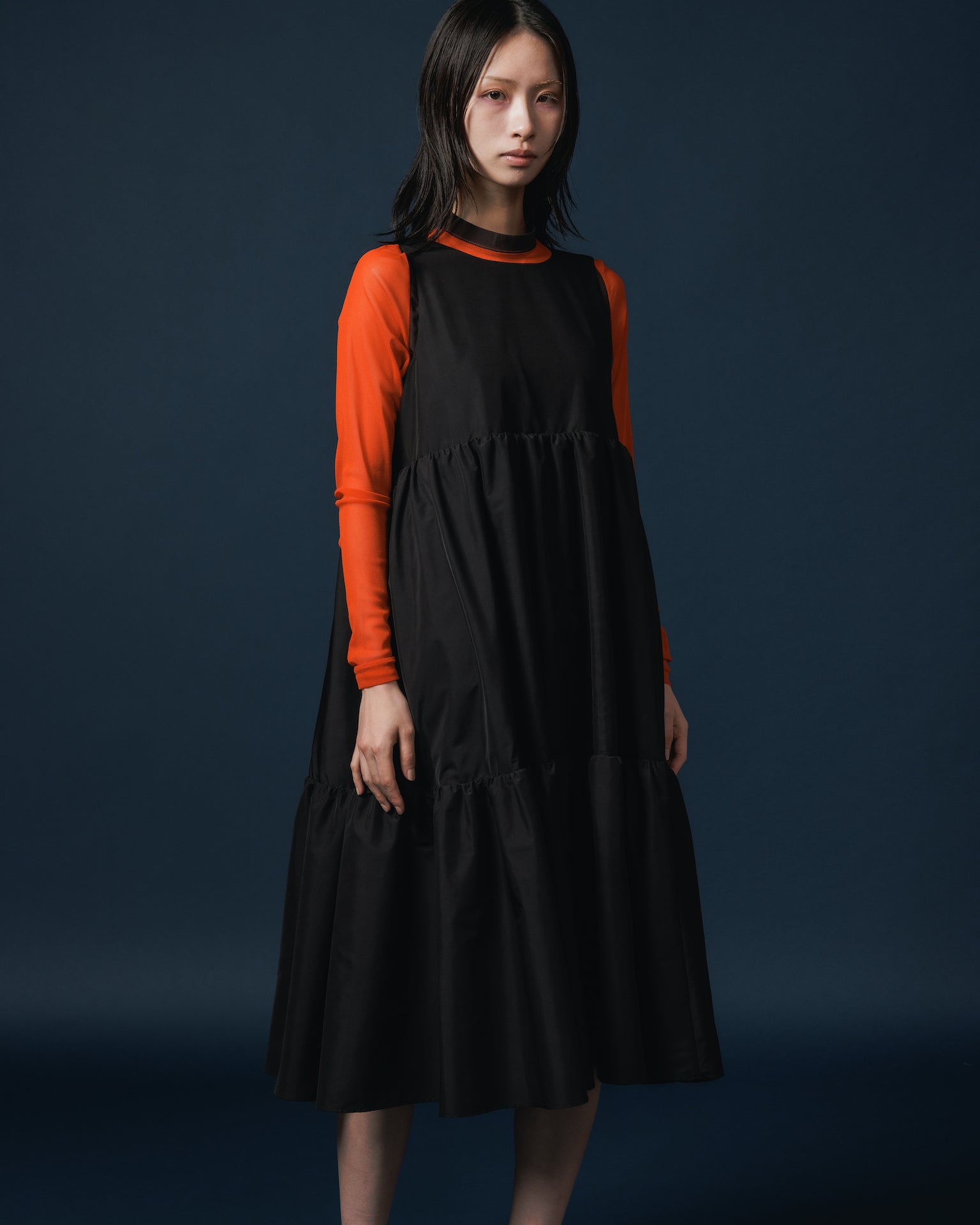 身頃にはギャザーがたっぷり入っていますが、薄手の軽量ナイロンを用いているので重さを感じず、柔らかい質感で着心地が良いです。