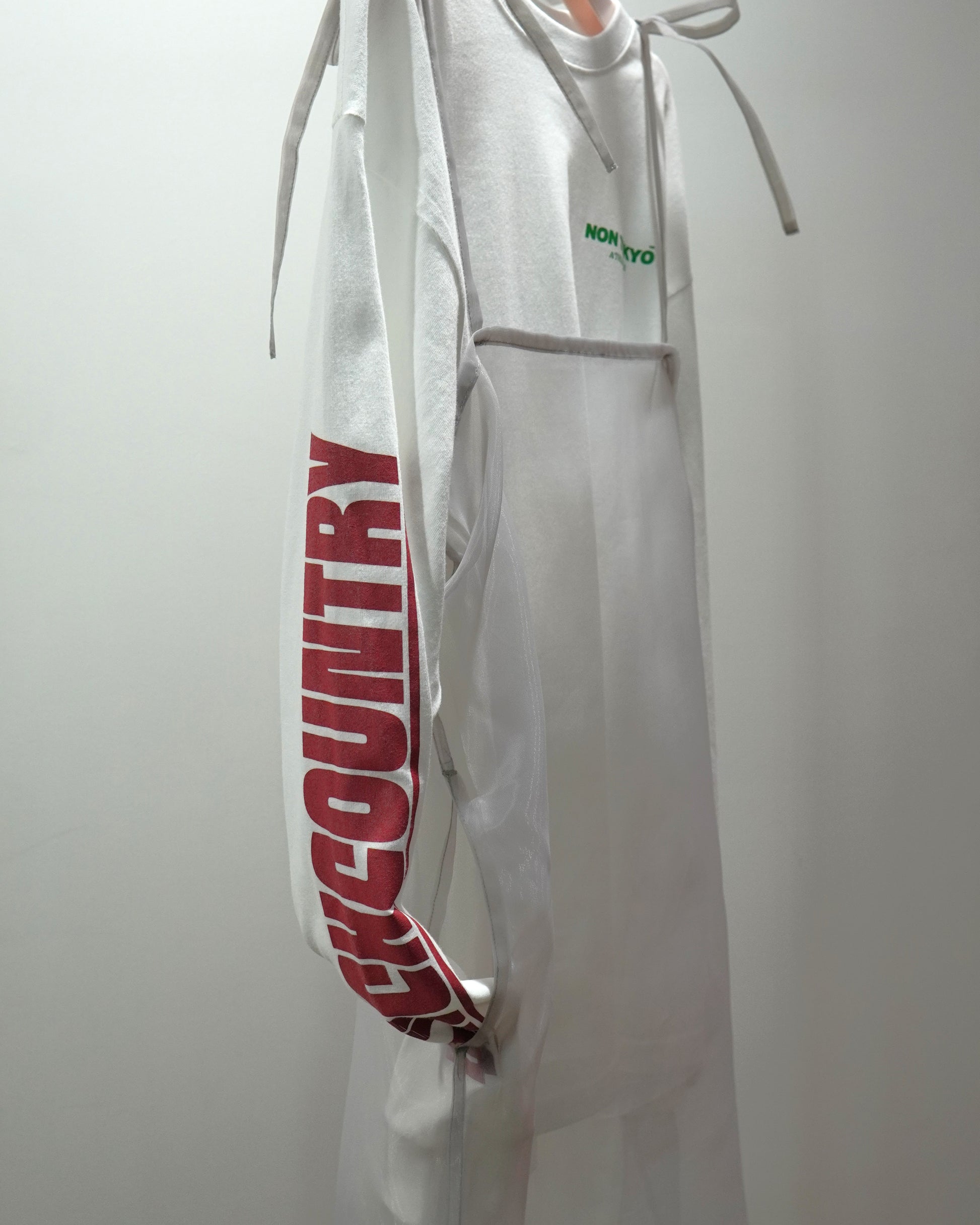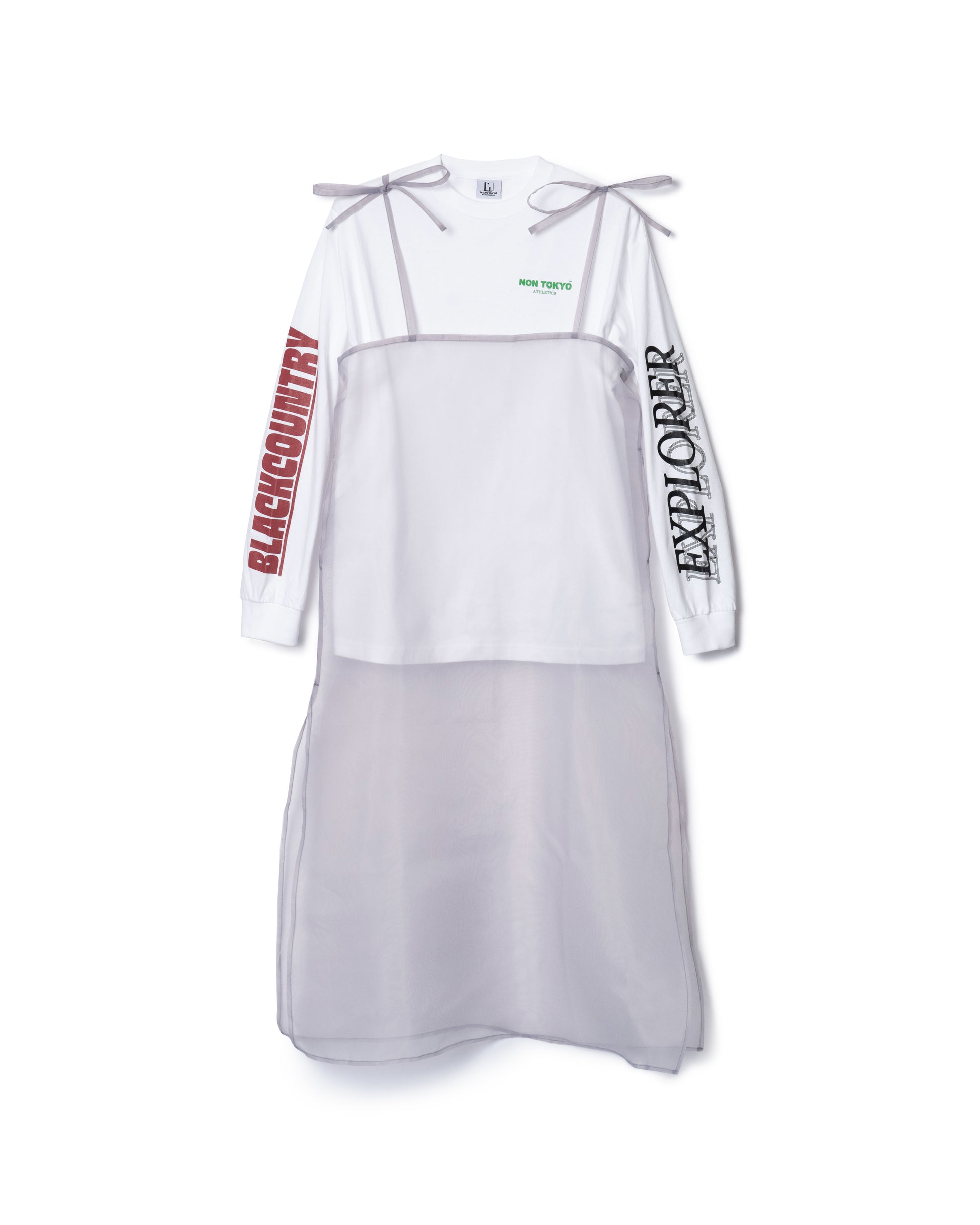 オリジナルグラフィックがプリントされた ロンTにシアーキャミソールがレイヤードされたワンピース。