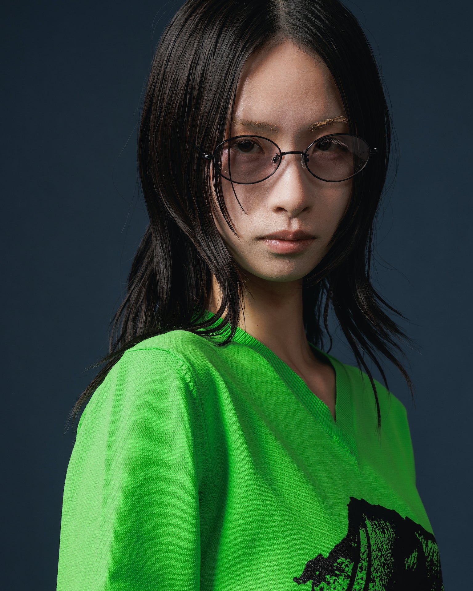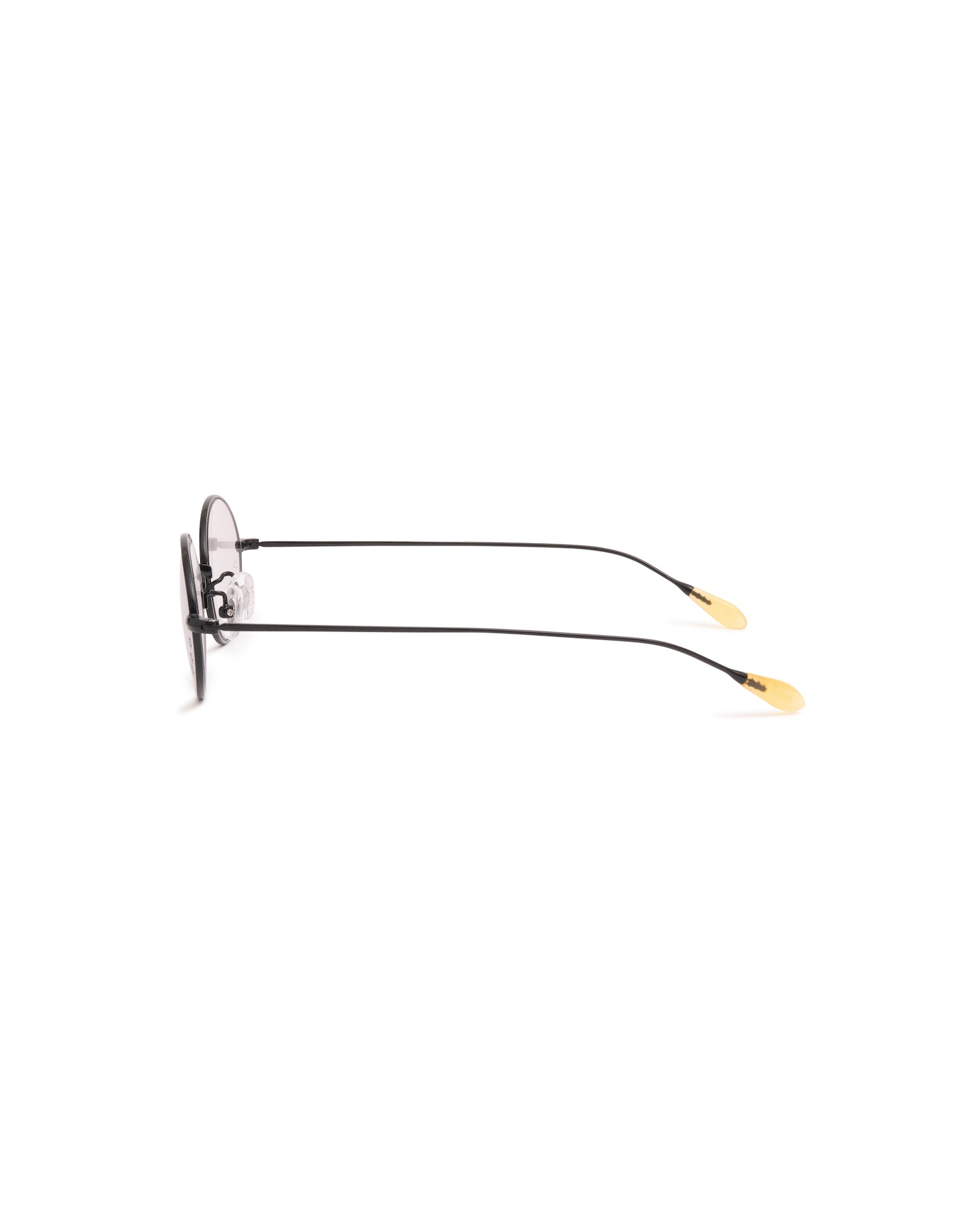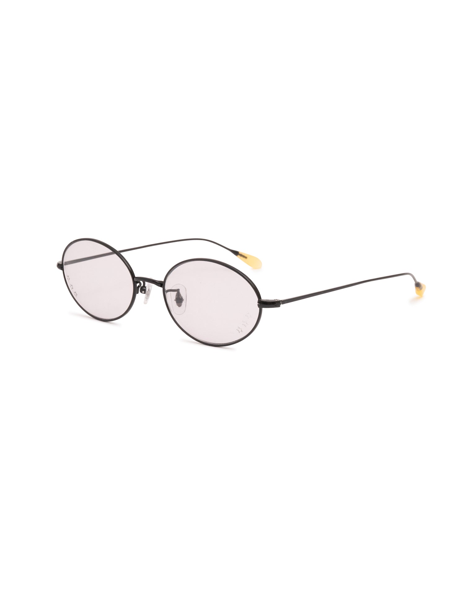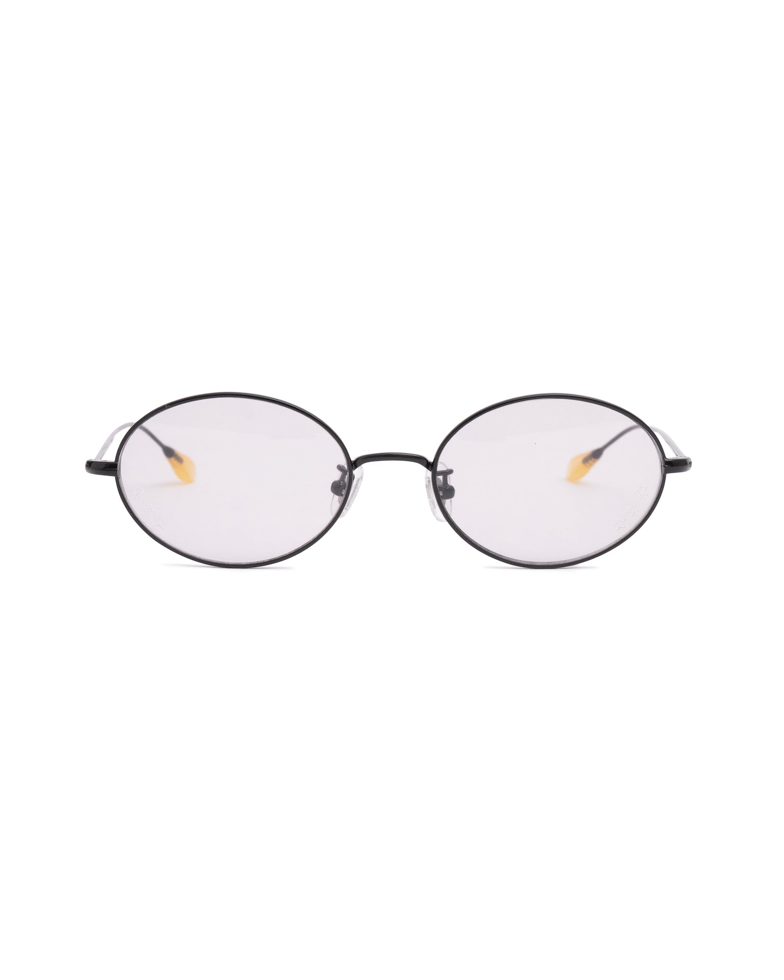 2色使いの細リムの前枠とテンプル先端の小さなアイコンの組合せが特徴的なメガネです