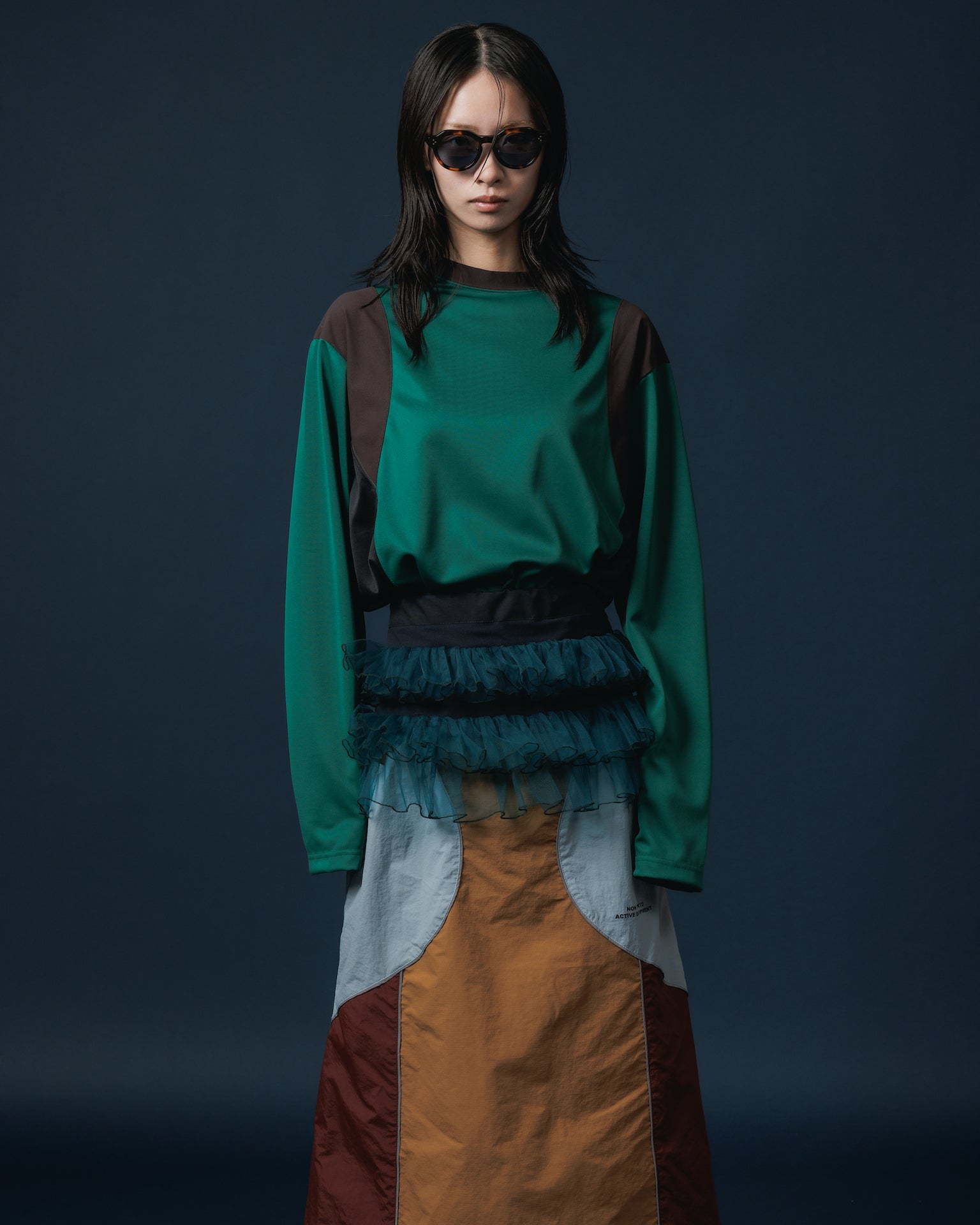 シアーのニット素材と綿のようなやわらかい薄手のジャージーを組み合わせています。