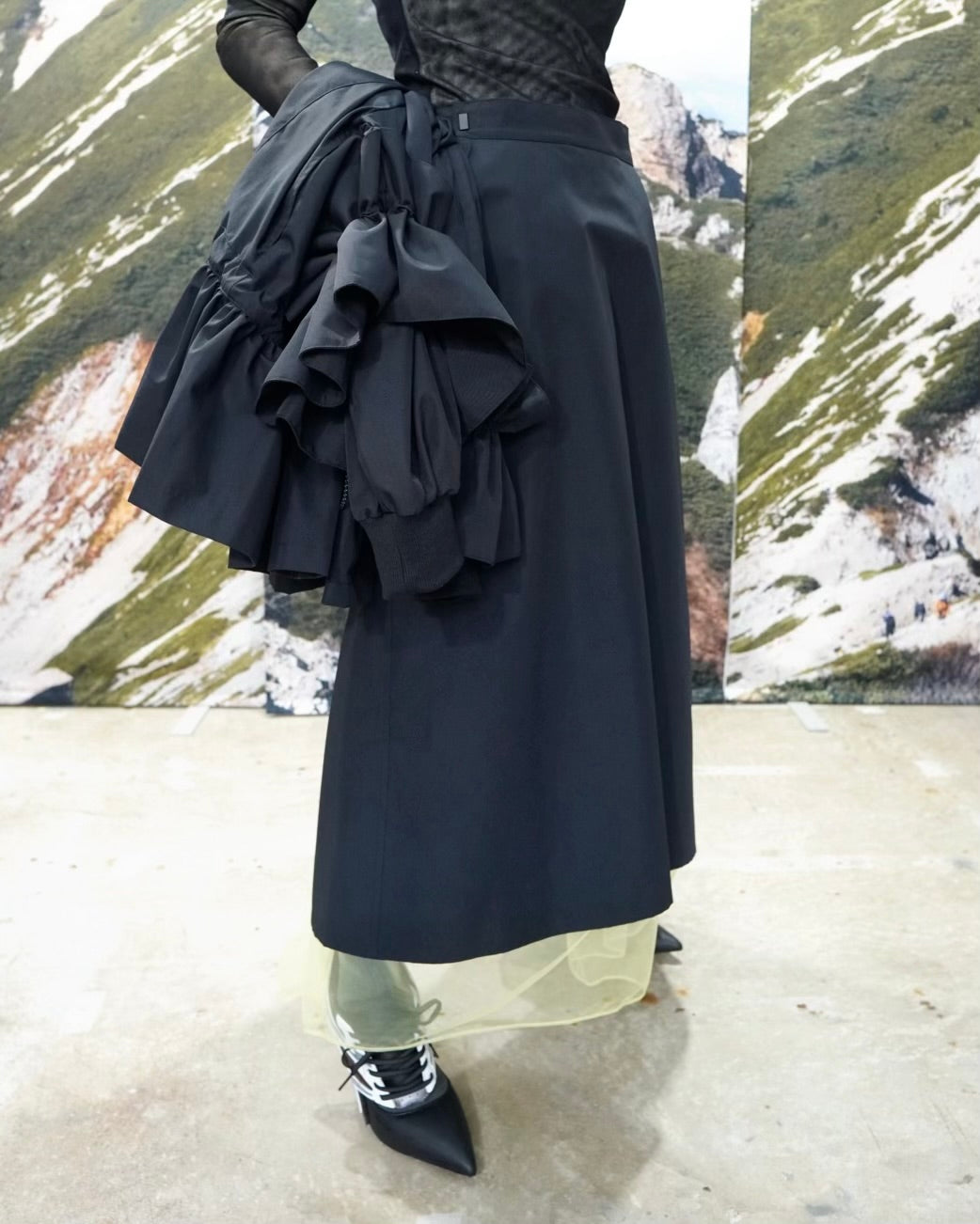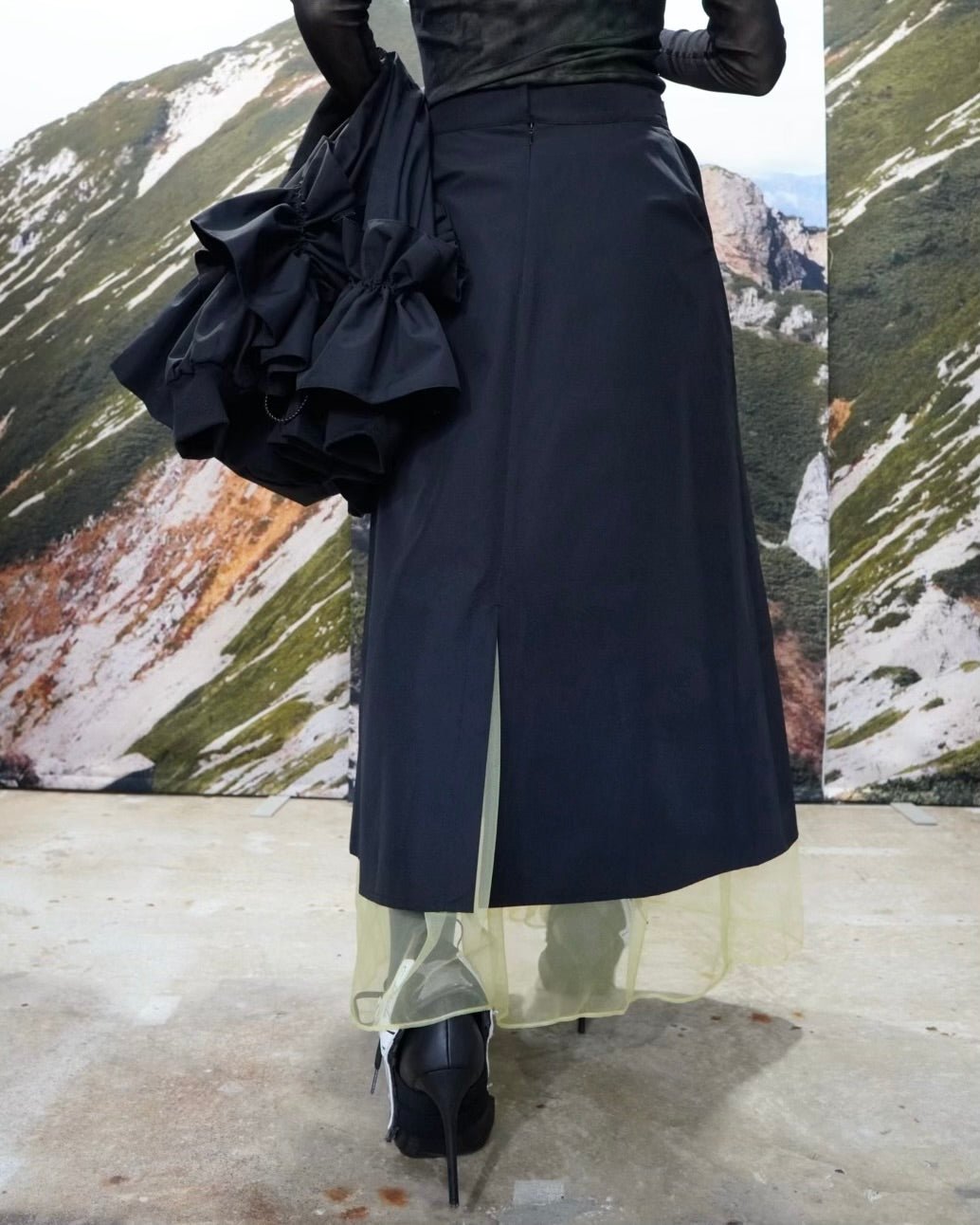 裏地の裾にシアー感のあるチュールをレイヤードしているので、後ろのスリットからも動きが見えます。