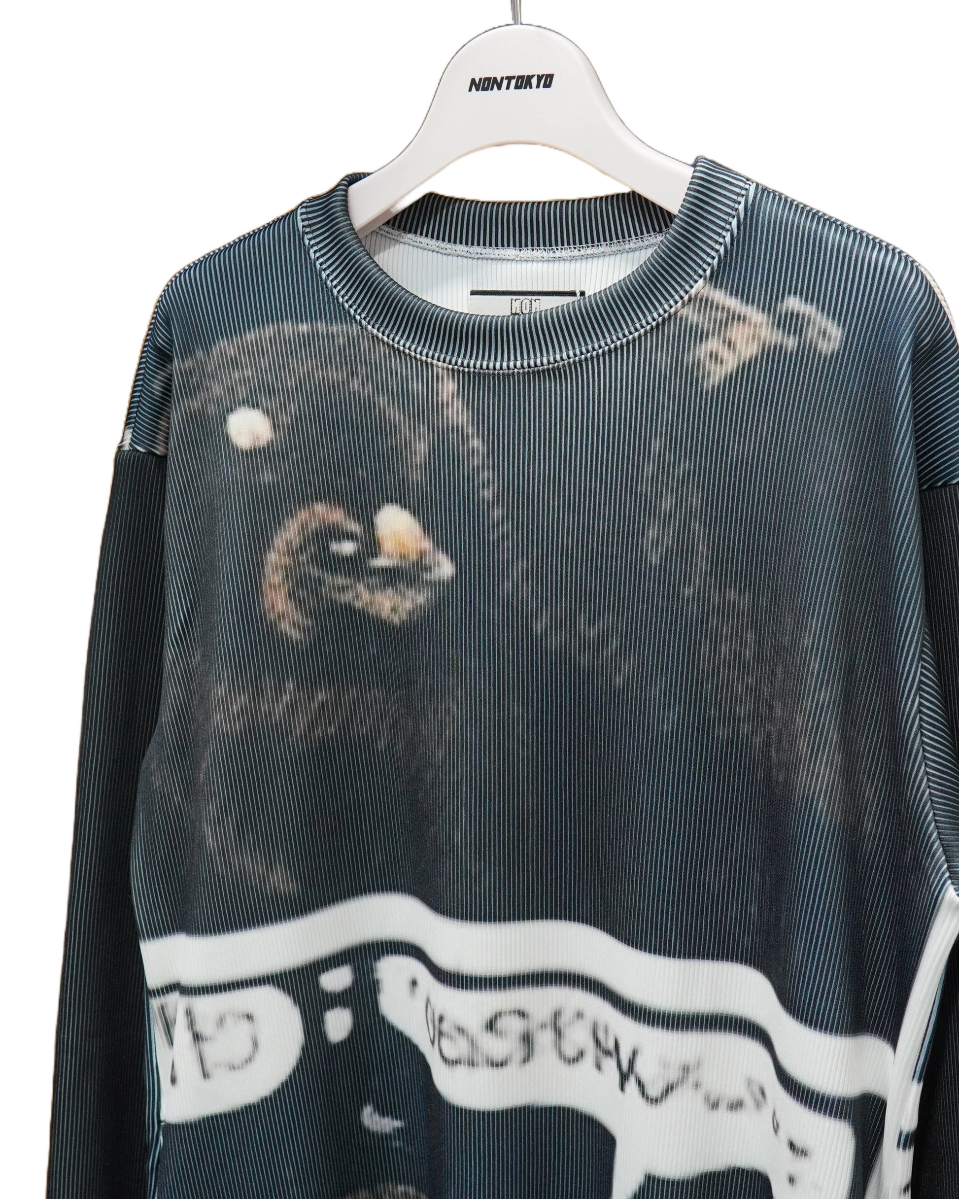 ハリとコシのあるリブを使用したクルーネックの長袖プリントワンピース。